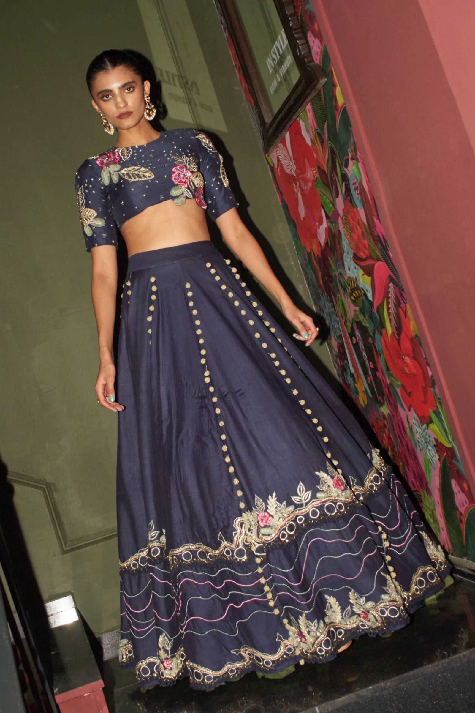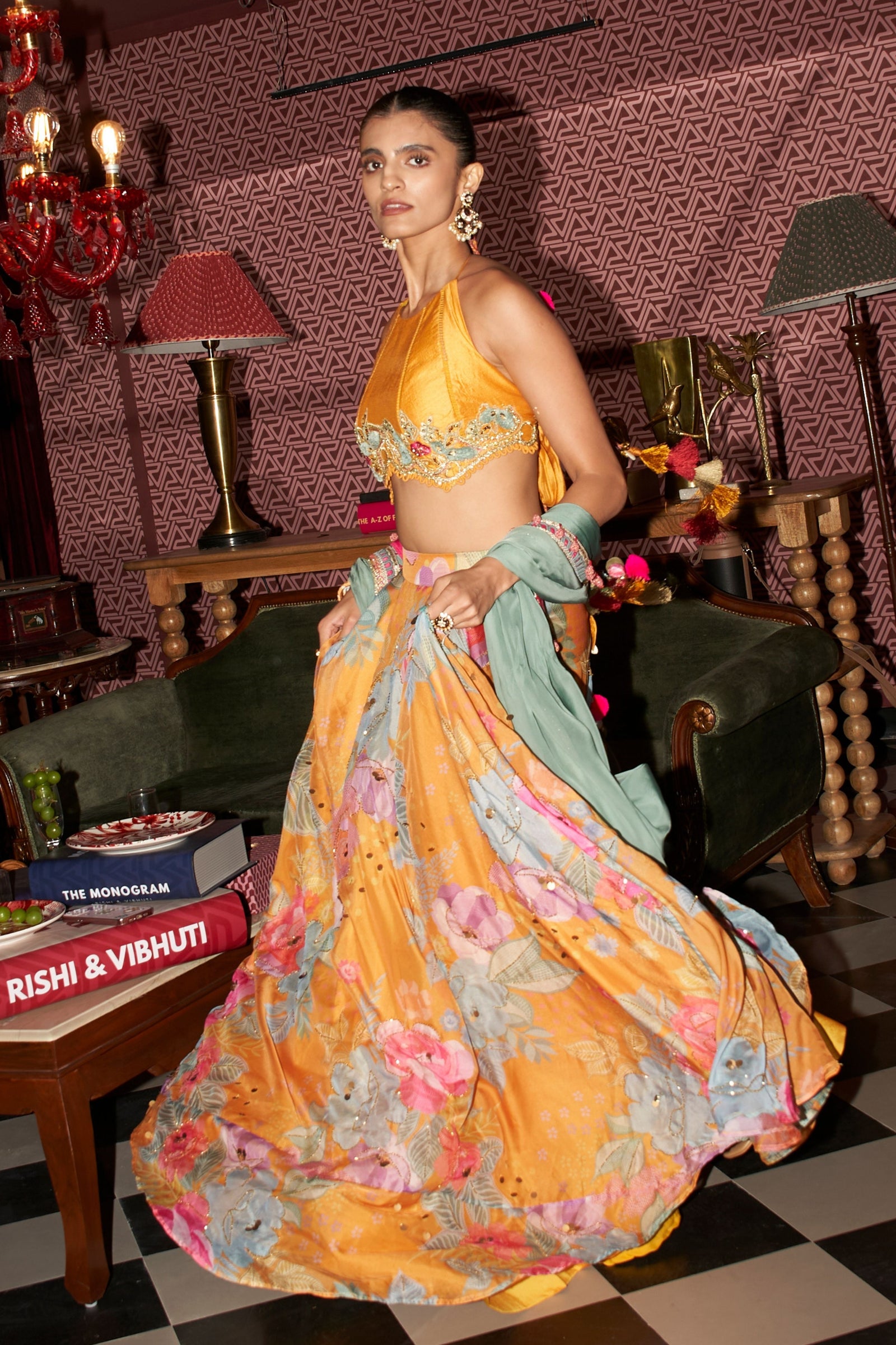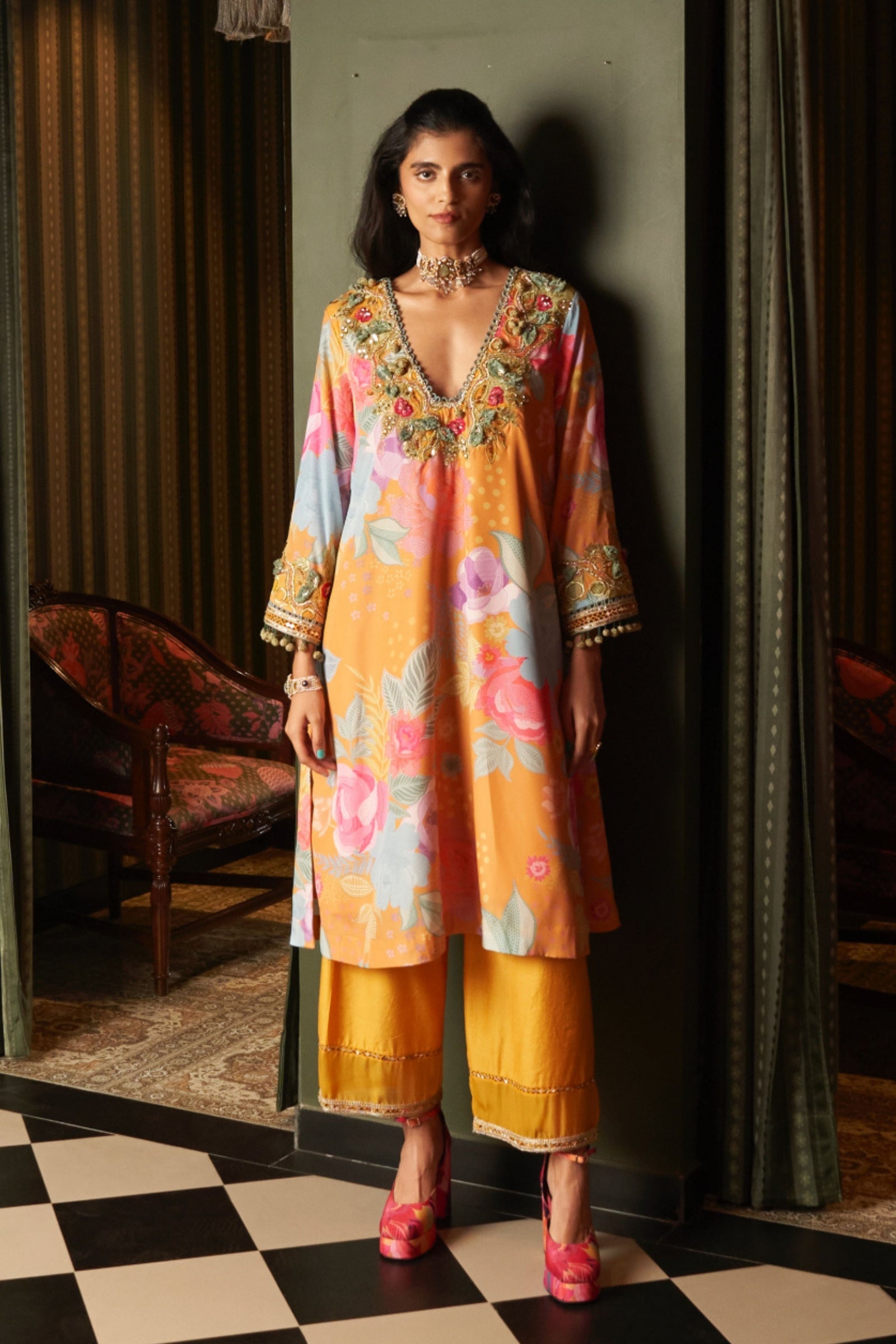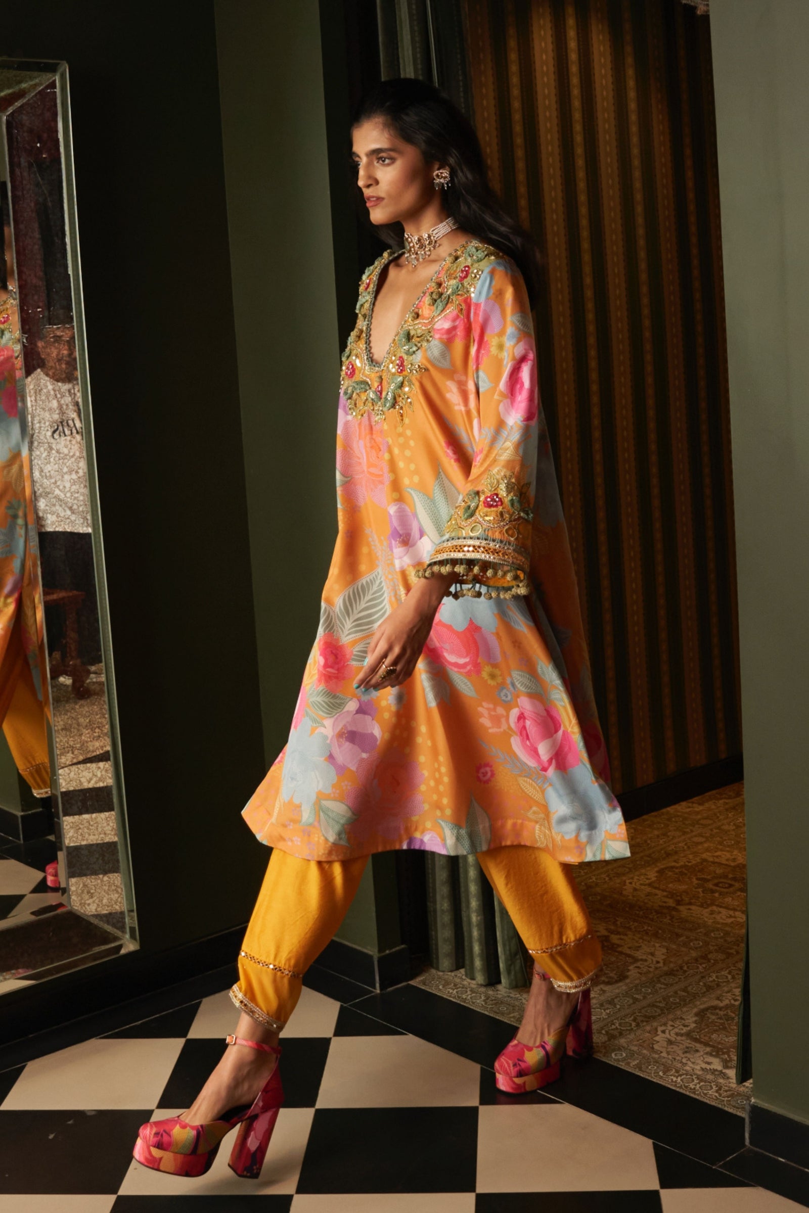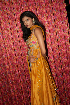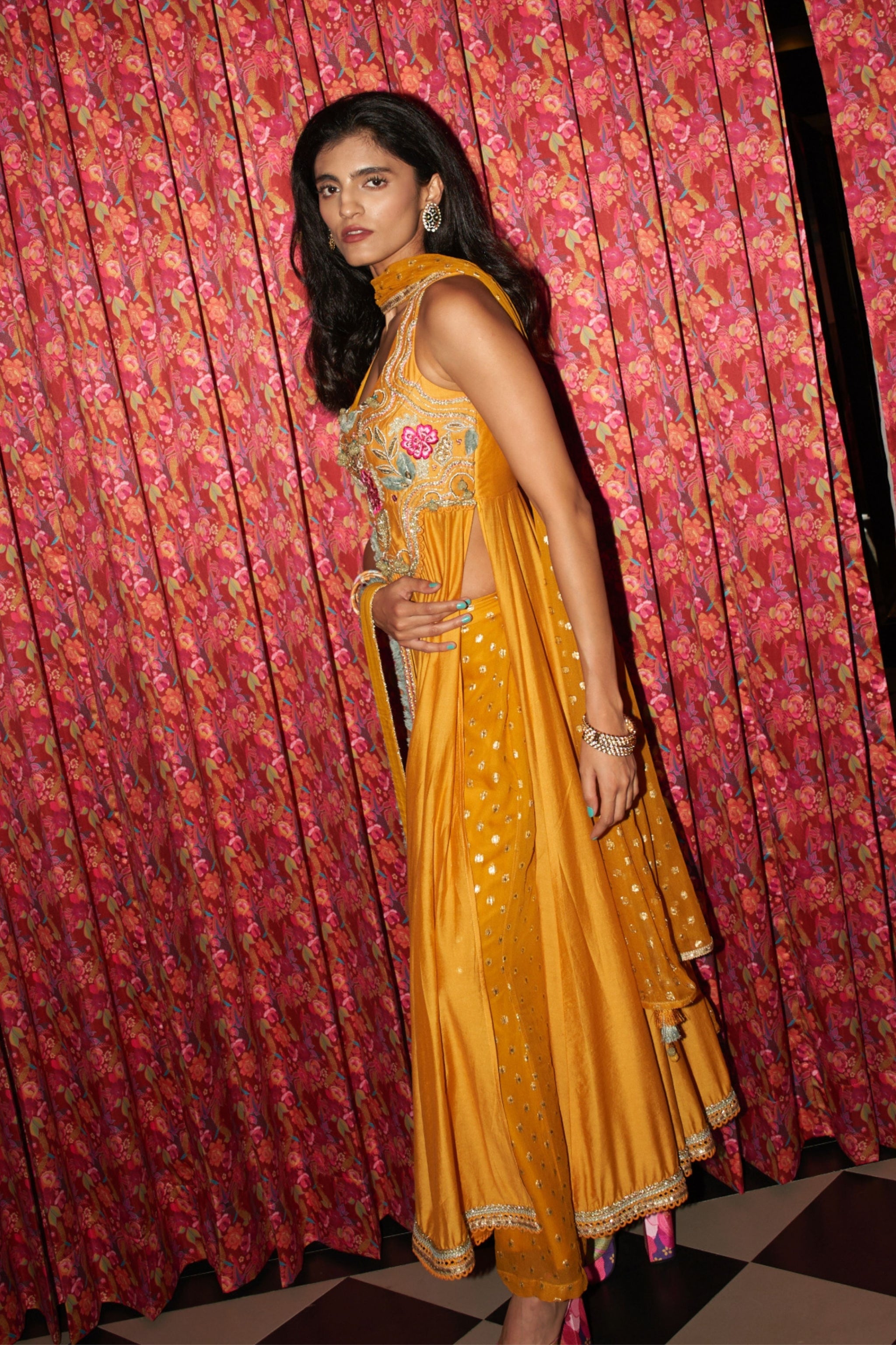 • This marigold yellow outfit in crepe features a defined neckline with floral threadwork and hand detailing on the yoke. The set includes an anarkali, pants, and dupatta, designed in a flattering fit-and-flare silhouette.