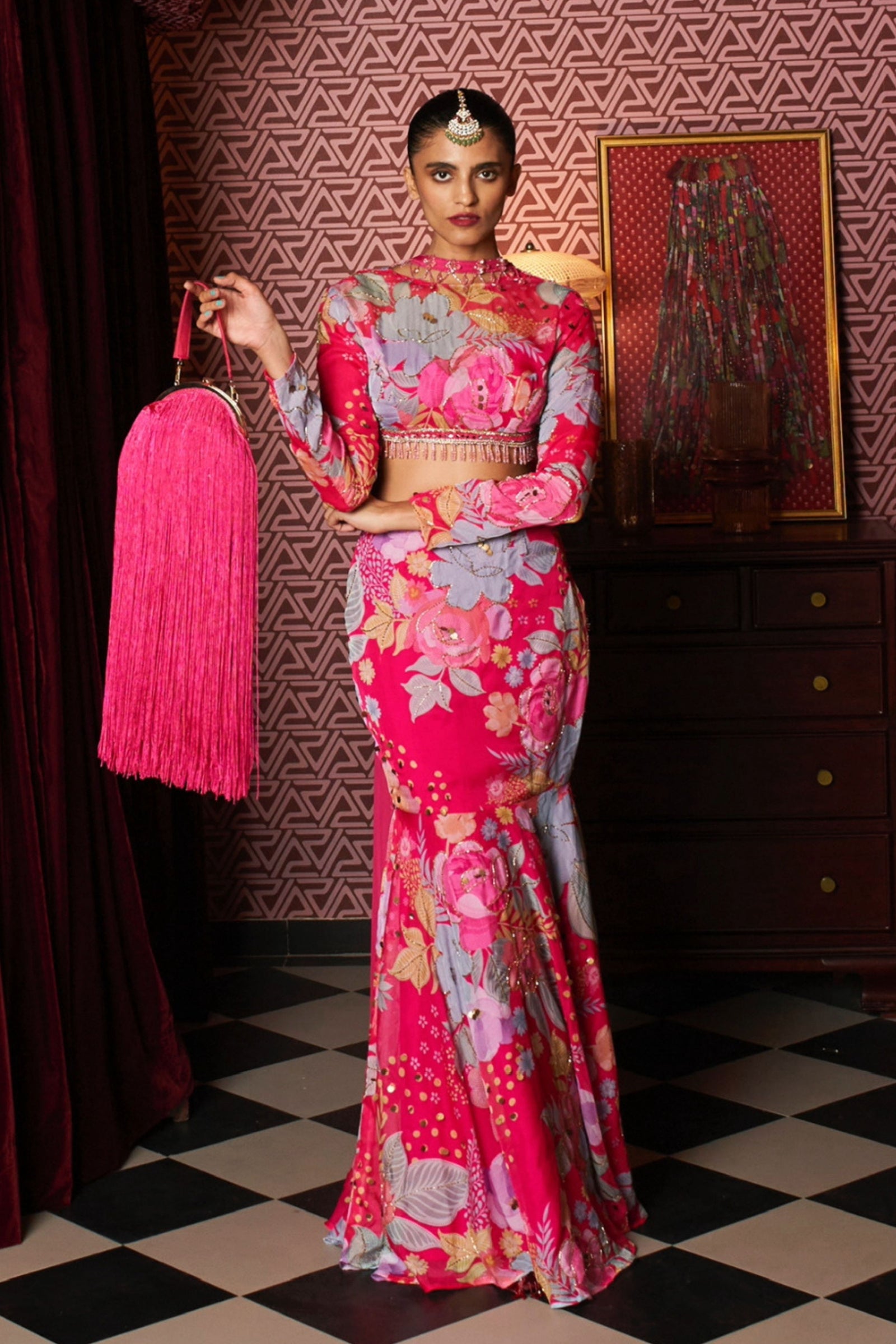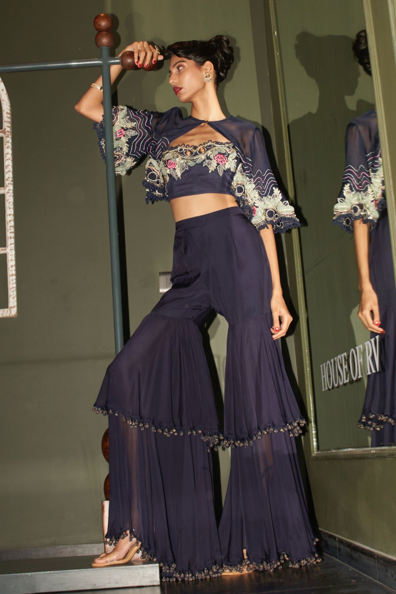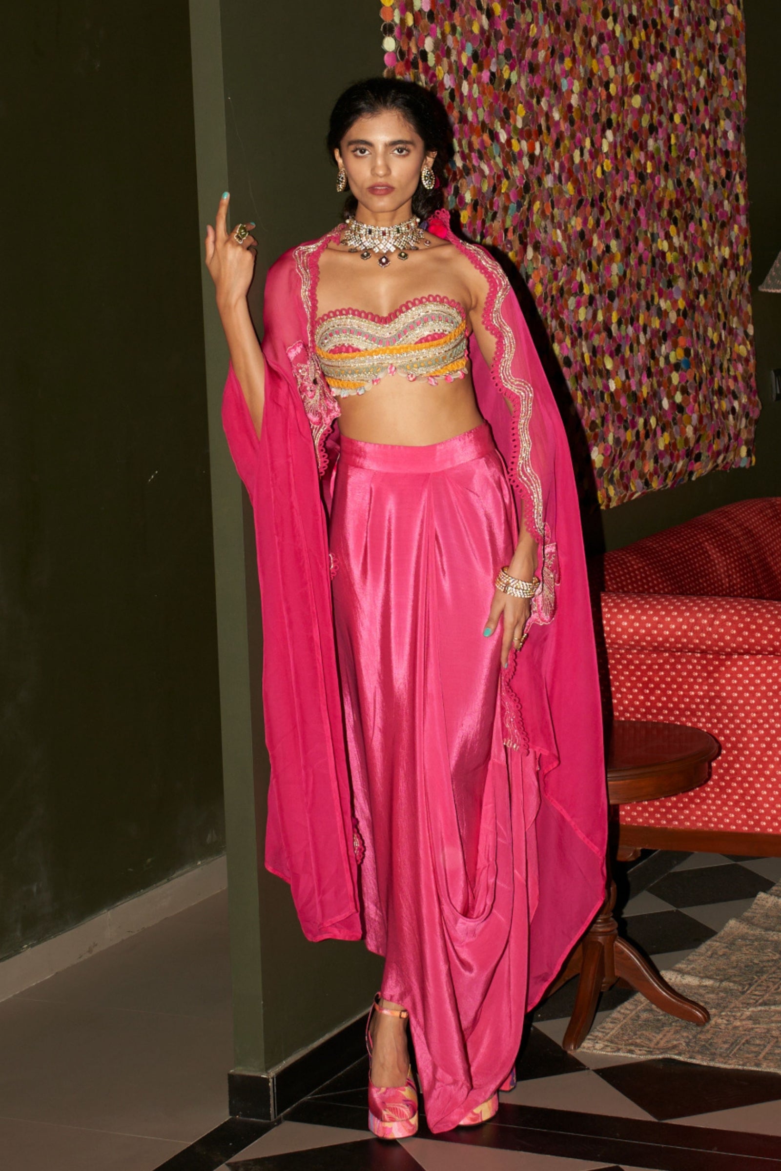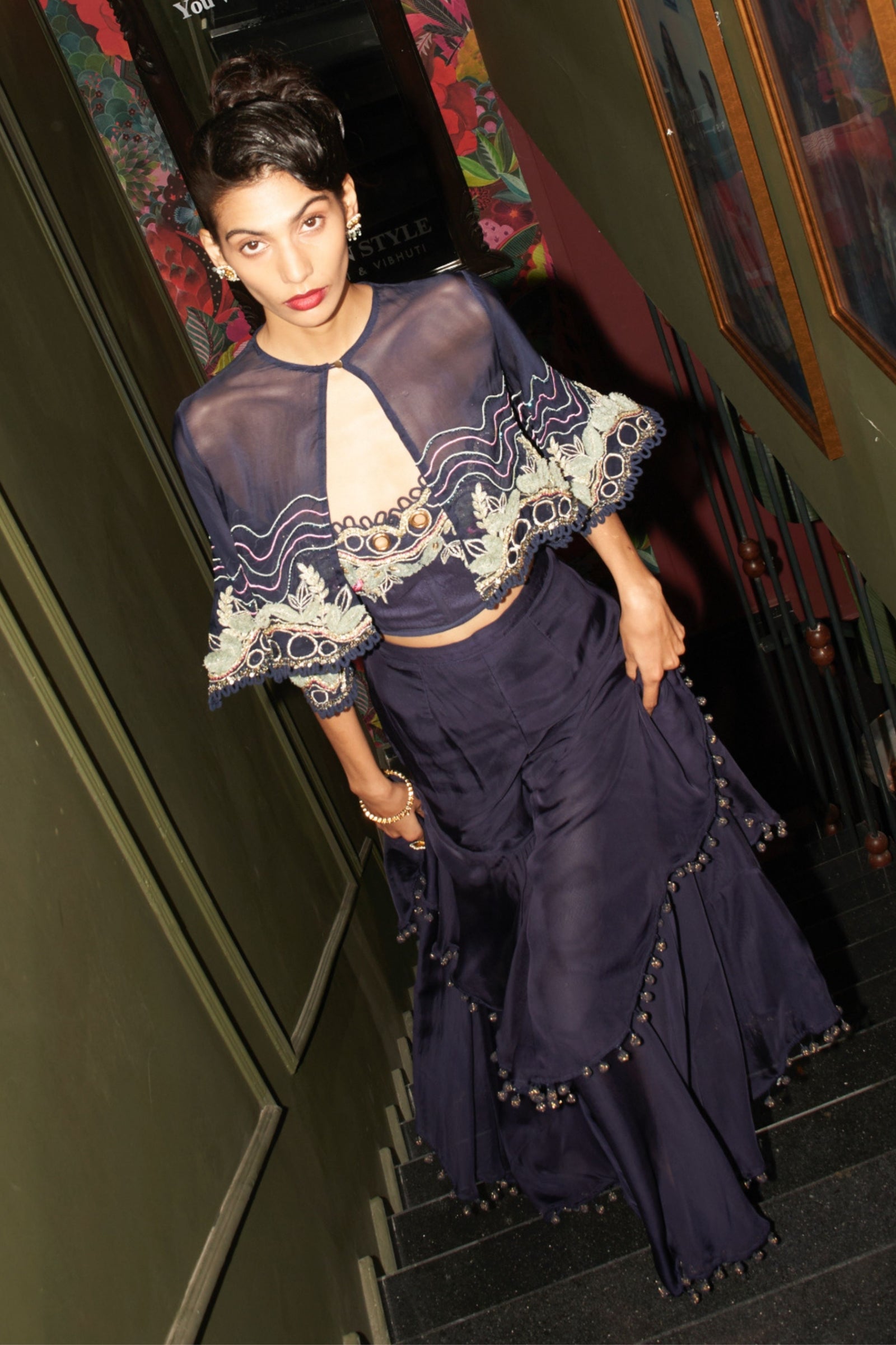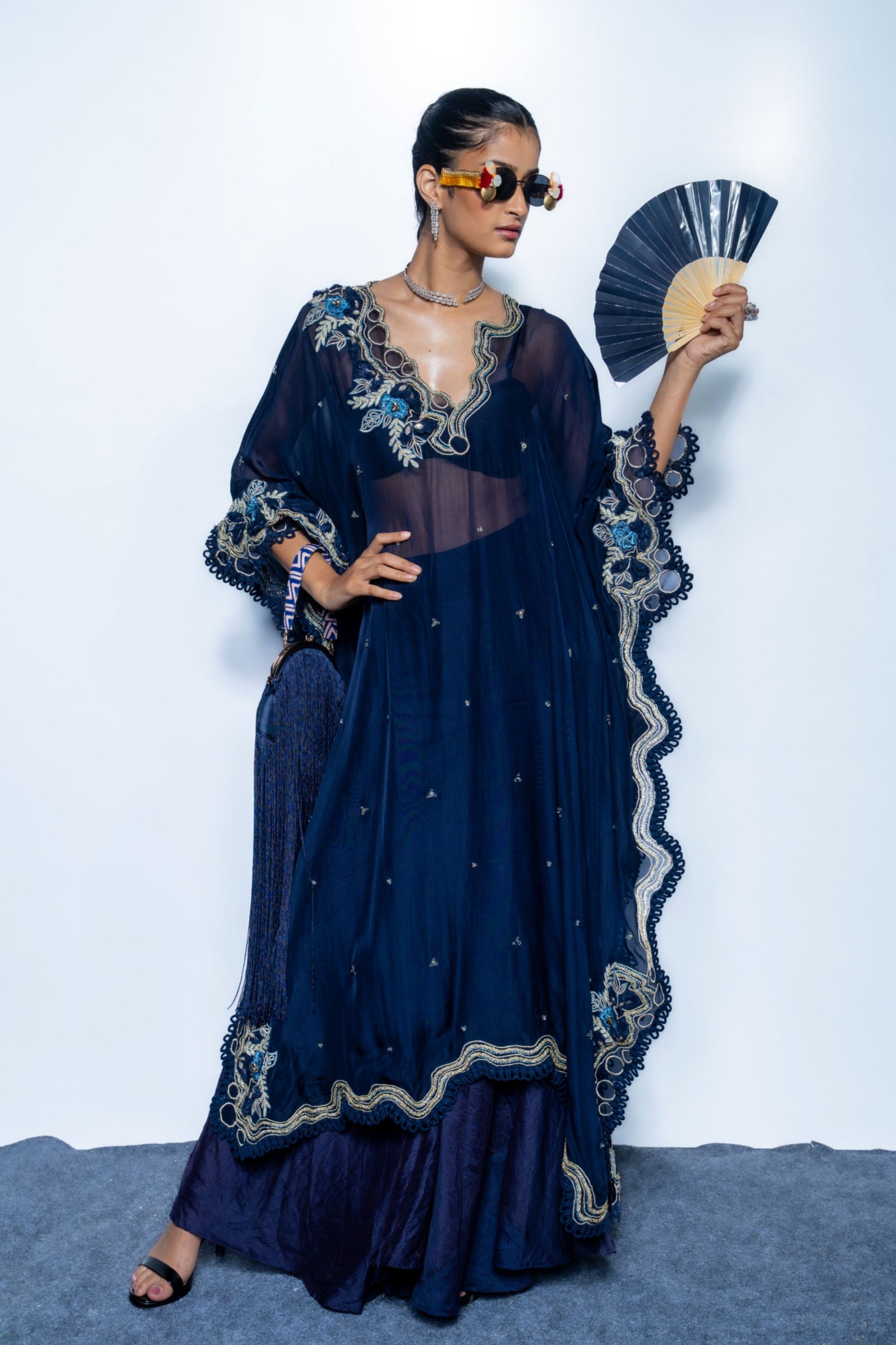 • This marigold yellow outfit in crepe features a defined neckline with floral threadwork and hand detailing on the yoke. The set includes an anarkali, pants, and dupatta, designed in a flattering fit-and-flare silhouette.