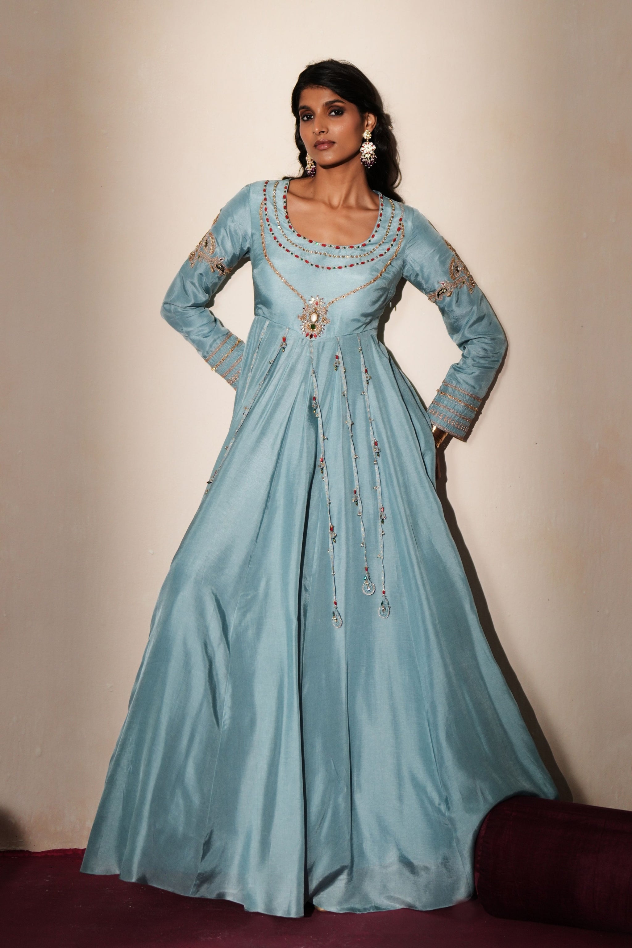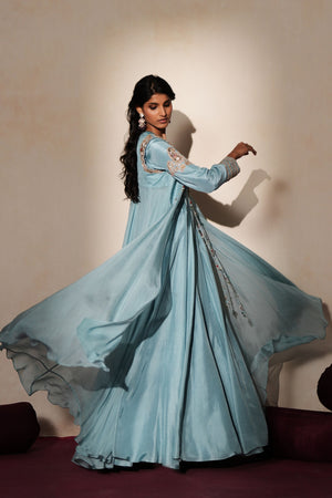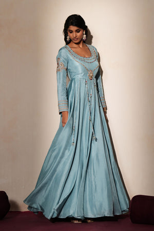 • Bathed in the serene glow of kanchan, this metallic pastel blue anarkali set captures the essence of regal femininity with a modern edge. The silk anarkali features an intricately jeweled neckline, exuding subtle opulence, while the organza-silk flared jacket is adorned with patchwork embroidery, dori-marodi detailing, and 3d handcrafted motifs. Delicate handmade tassels lend graceful movement, bringing alive the artistry of indian couture.