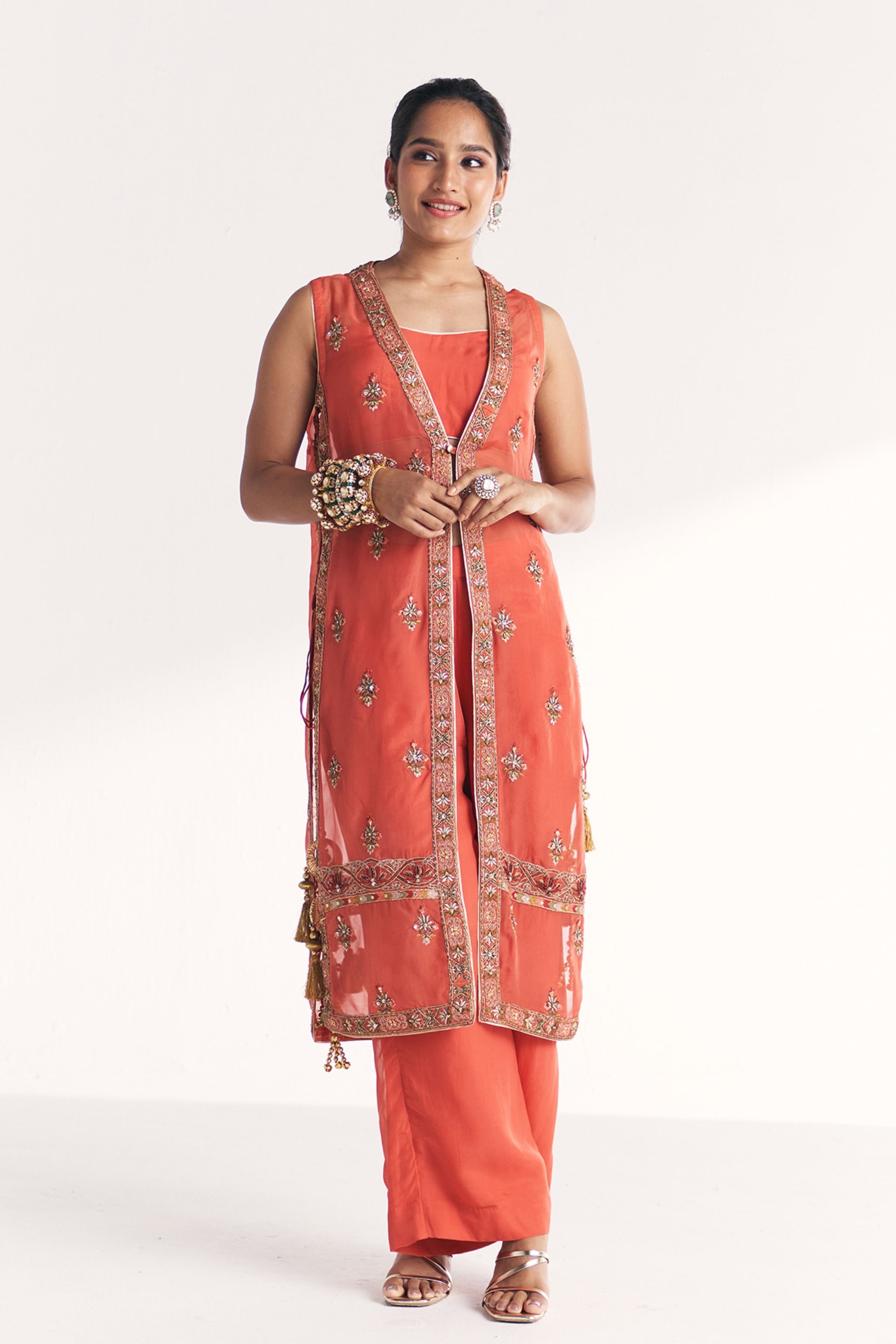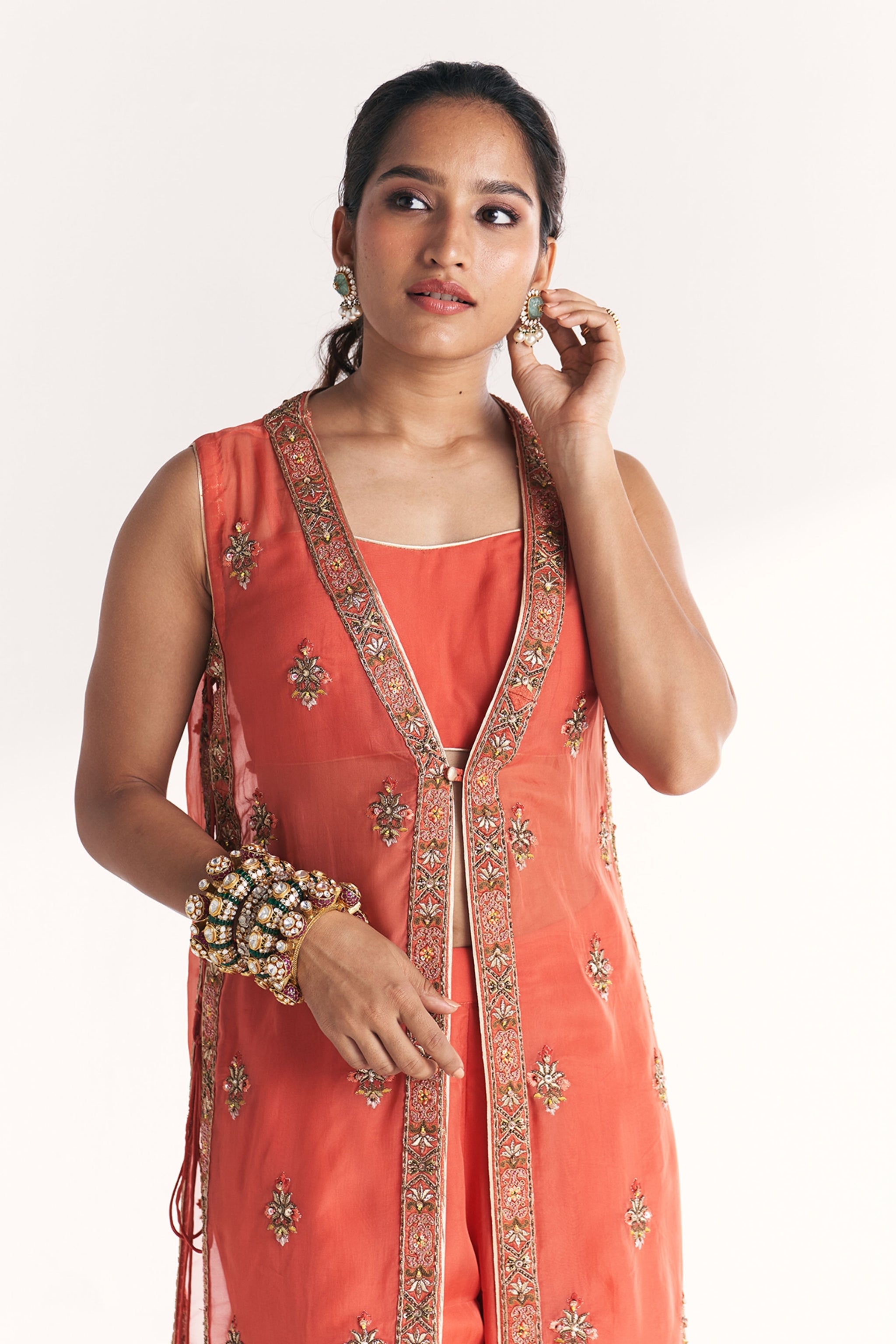 • The set consists of bustier, pants and jacket. The jacket has beautifully embroidered panels which brings the elegance. The set is perfect for the playful festive occasions.