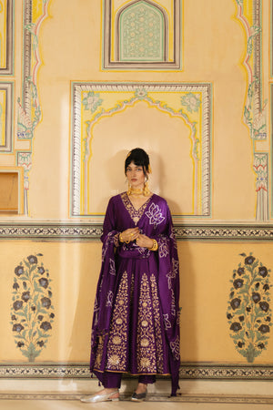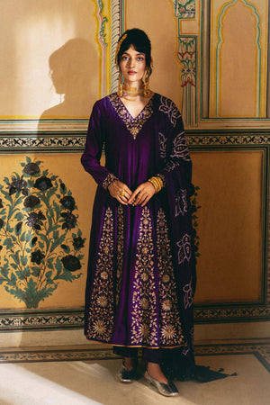 • This kalidaar anarkali is embroidered with a flock of lotuses. It comes with a matching lotus butta on dupatta which is highlighted with embroidery.