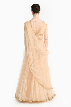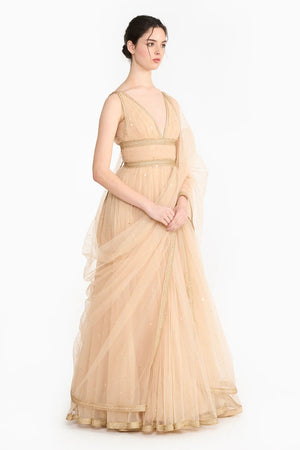 • Peach anarkali with attached dupatta and churidar.
