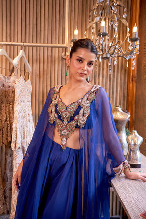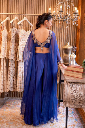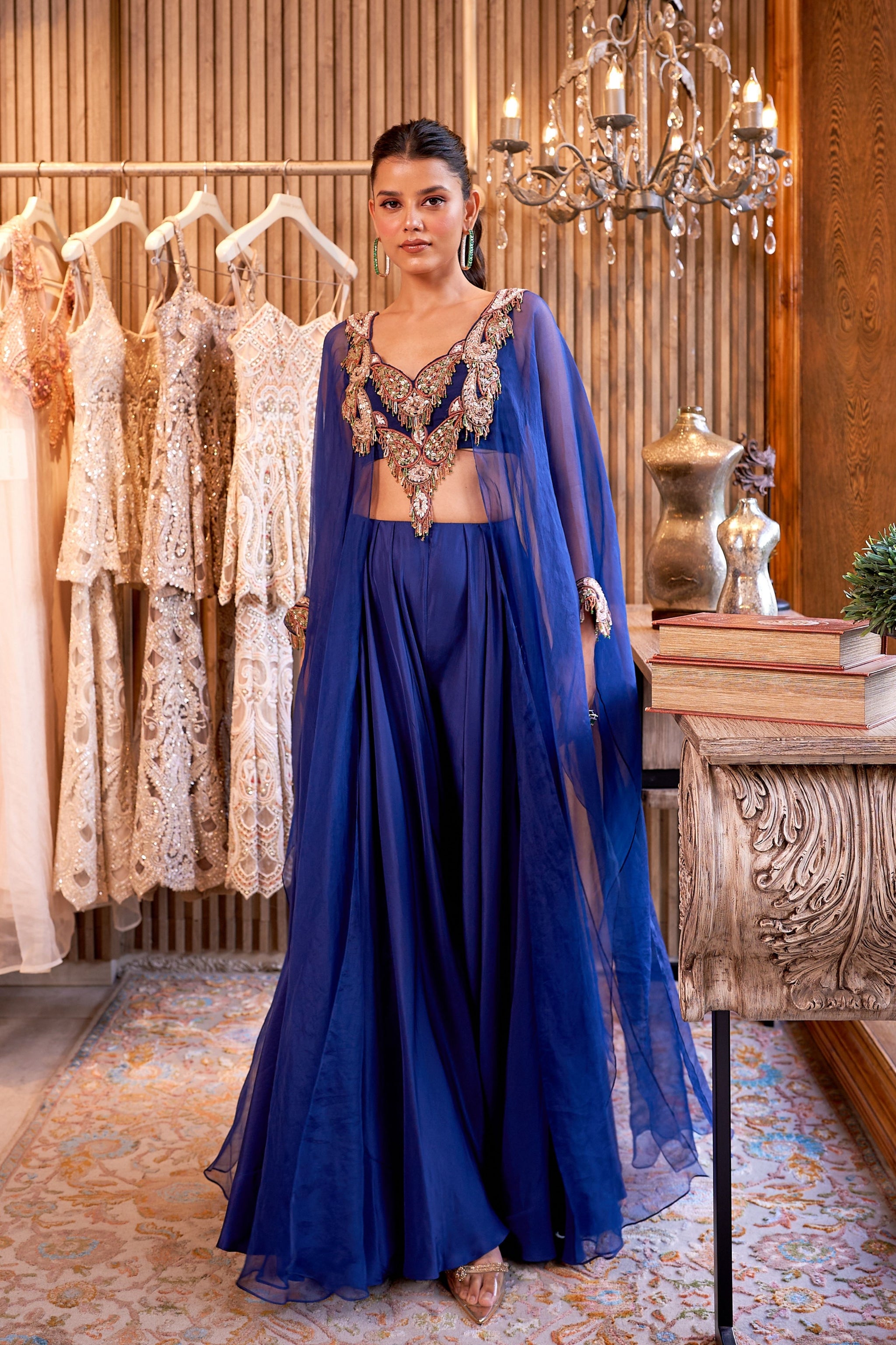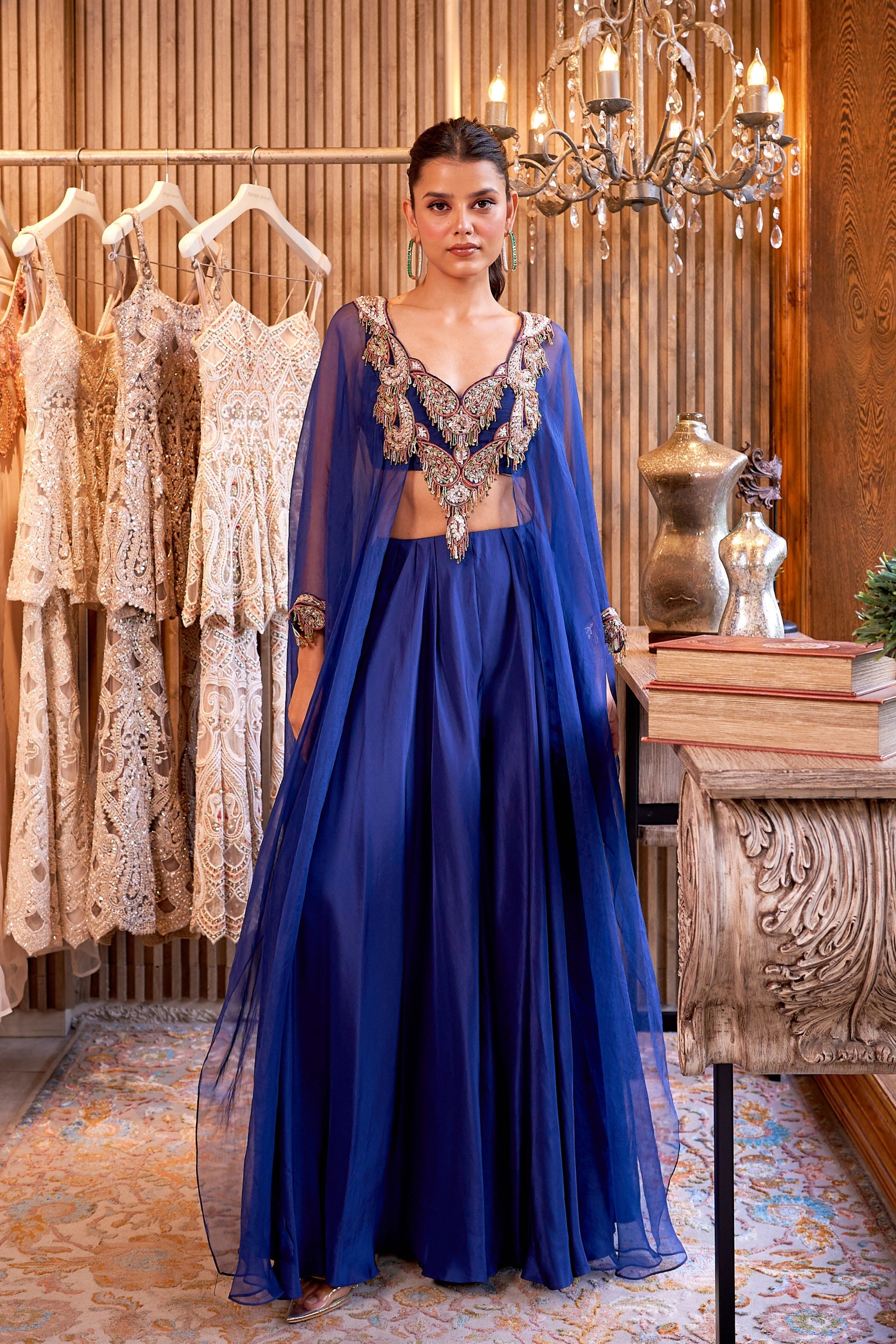• The art of craftsmanship with the Tabeer Kurta Set. The kurta, embellished with delicate details, drapes elegantly over silk palazzos. The mix of organza and silk creates a classic silhouette, blending rococo charm with modern sophistication.