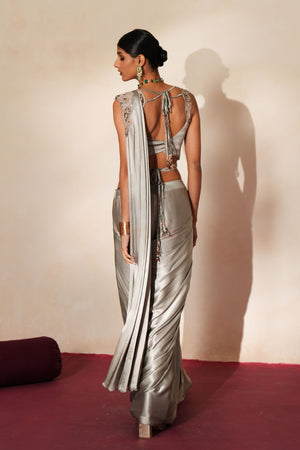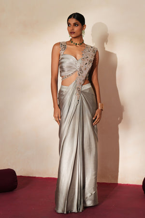 • Ethereal and fluid, raja noor reflects the timeless grace of indian draping, reimagined in a modern pre-draped form. Crafted in flowy chiffon satin in metallic grey, it features intricate dori-marodi embroidery on the pallu, highlighted with 3d cutwork motifs and fine jadau embellishments that glisten with quiet luminosity. The look is elevated with a draped silk blouse, blending fluid form with artisanal precision , a seamless harmony of heritage and modern couture.