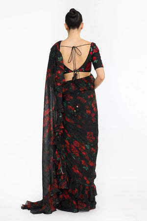 • Red rose creeper ruffled saree paired with embroidered blouse.