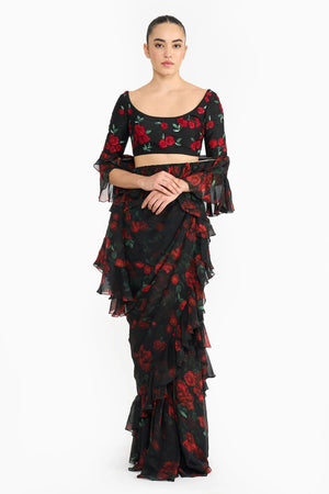 Red Rose Creeper Ruffled Saree Set