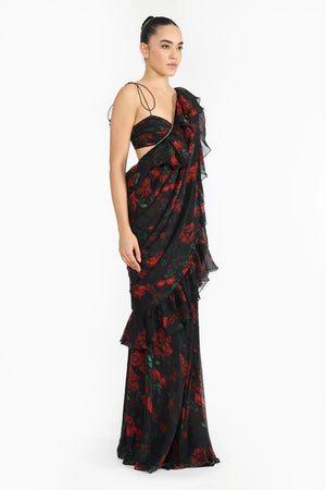 Red Rose Creeper Ruffled Saree Set