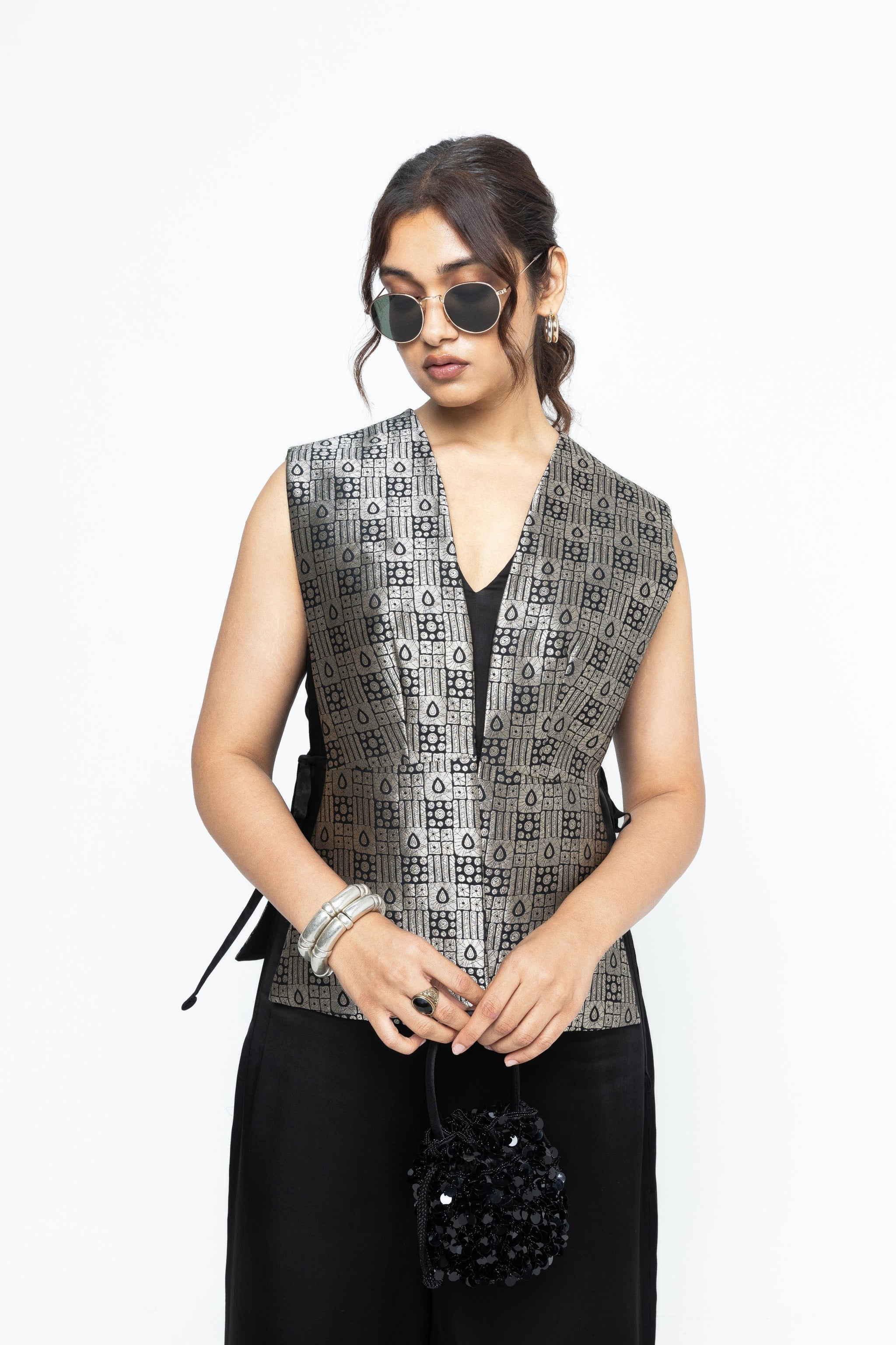 • Black gilet with tie details on the side paired with a matching Asymmetrical dress