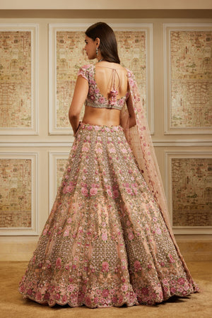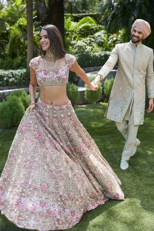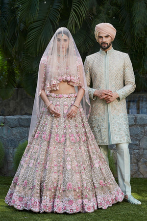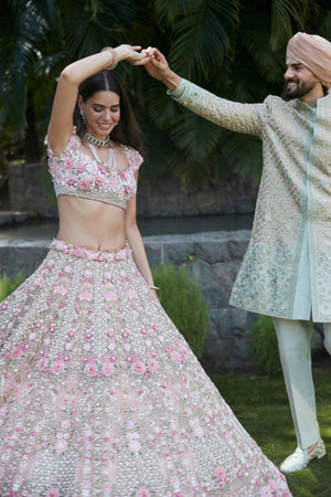 • Behold the splendor of ameera, a romantic dream. With exquisite work on net, having resham embroidery with effortless dance of sequins and cut-dana. The voluminous flare brings movement and grandeur, while the intricate flowers in soft pink hues add a youthful charm.The blouse, designed with a modern yet feminine neckline, is embellished with handcrafted 3d flowers and pearls, giving it a sculptural elegance. The silhouette is brought to life with hand embroidered sequins, threadwork and floral motifs. Completed with heavy dupatta with scalloping which completes the look.