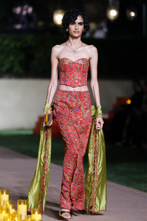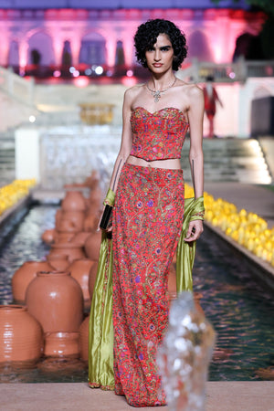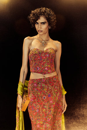 • Bringing modernity to our ancient inspiration is is contemporary three-piece set featuring a straight worked skirt - an innovation on our draped sari silhouette- paired with coin embellished corset blouse ad rounding it up is an embroidered dupatta making this a look you can wear as a set but also just as easily as separates