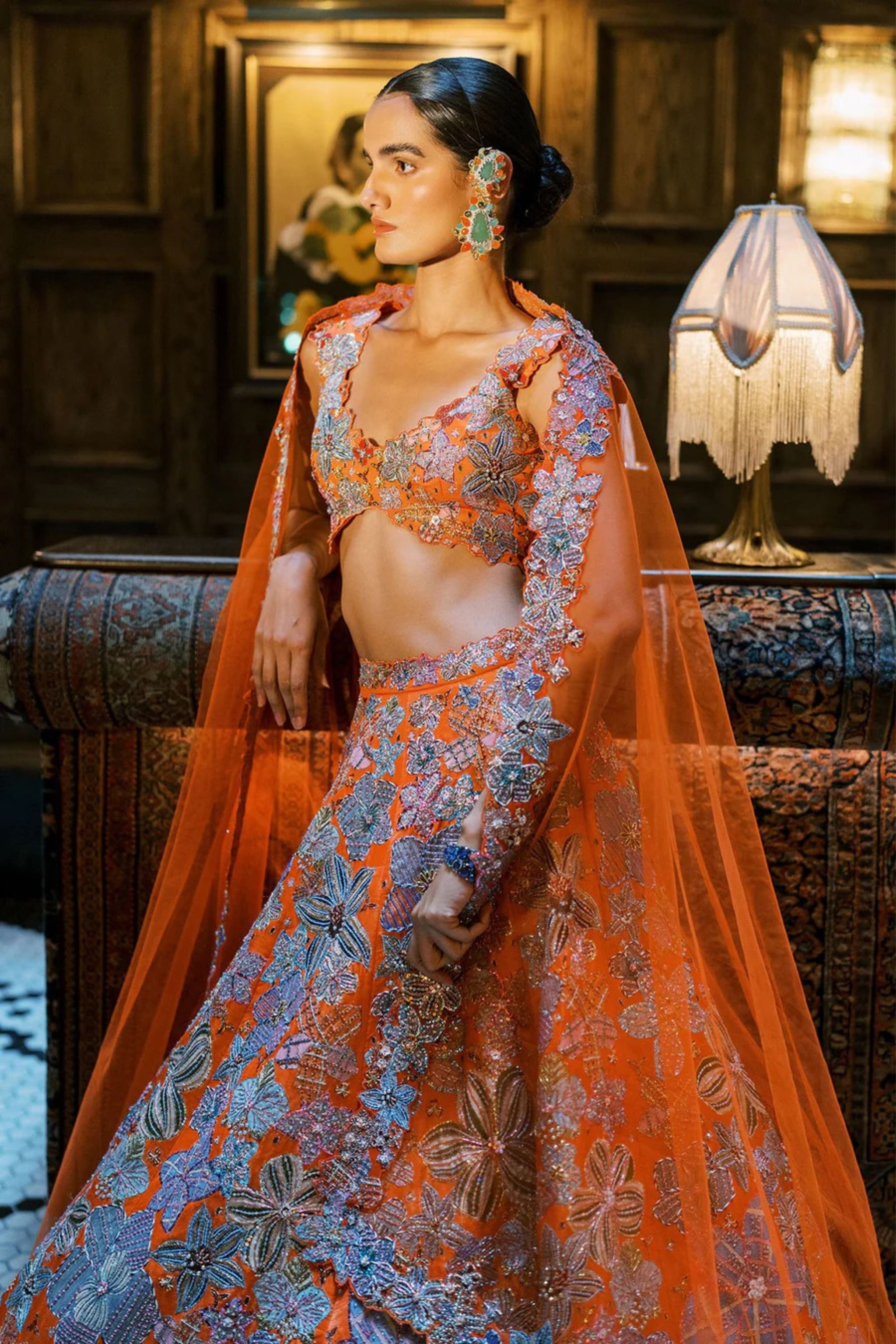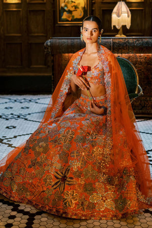 • Matilda orange printed embellished kasab satin lehenga with blouse and tulle dupatta