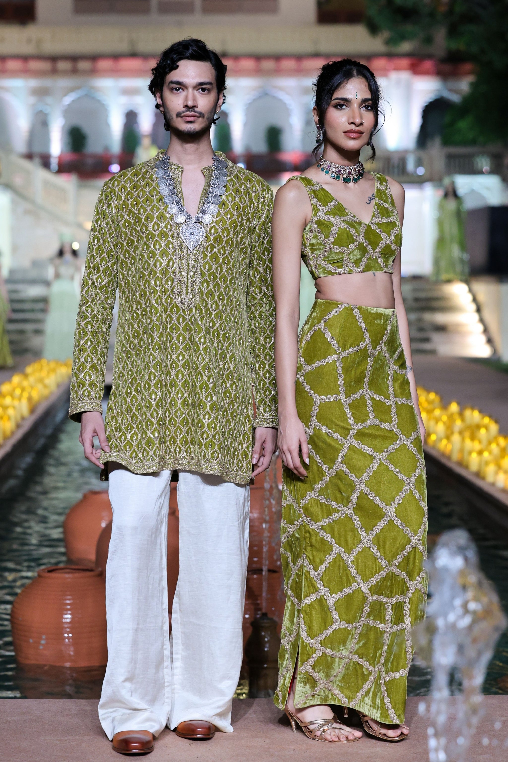 • Velvet skirt set with side slits and v-neck blouse beautifully embroidered with marodi work perfect for cocktail evenings.