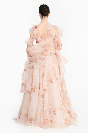 • Pink vintage rose lehenga paired with ruffled blouse and dupatta.