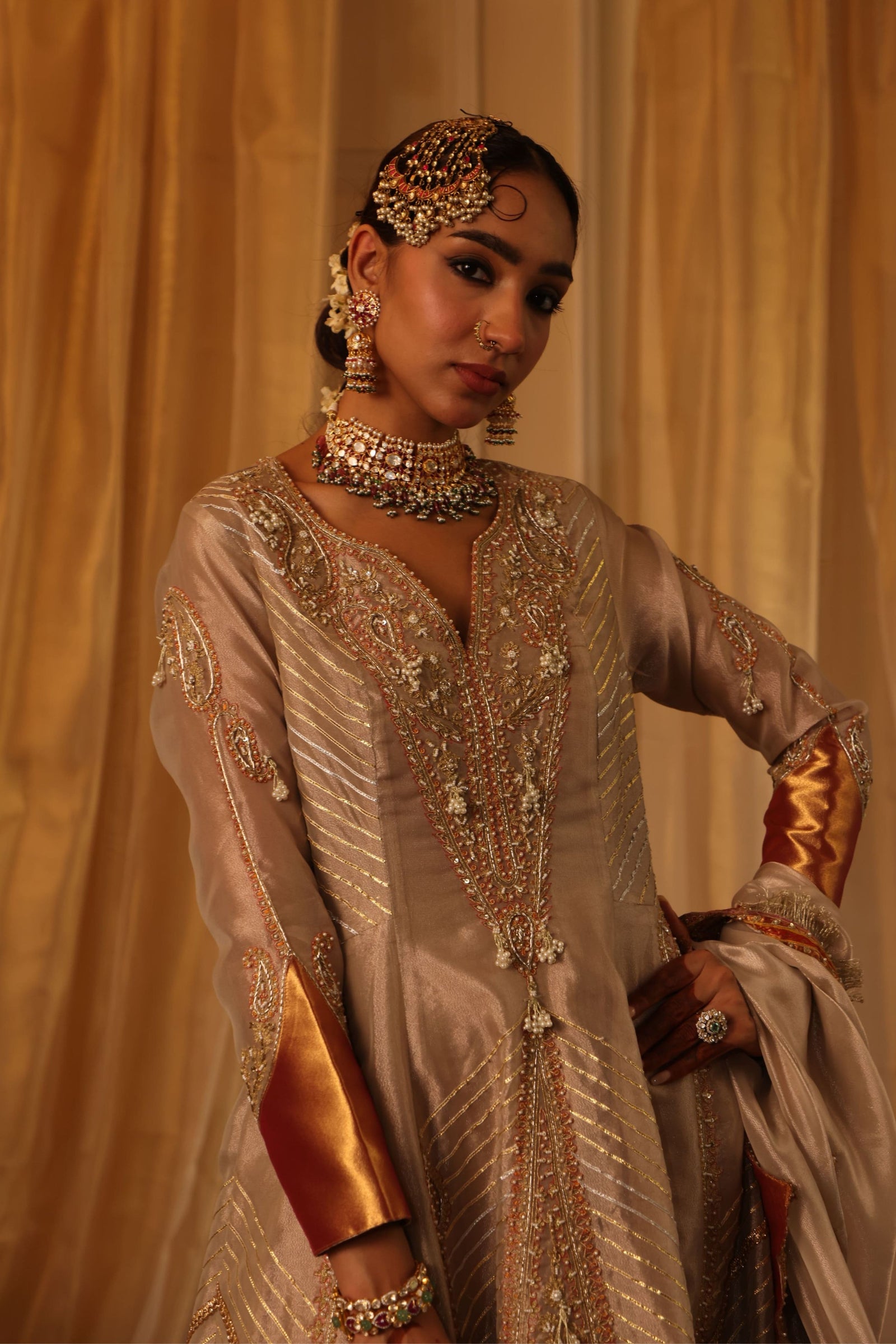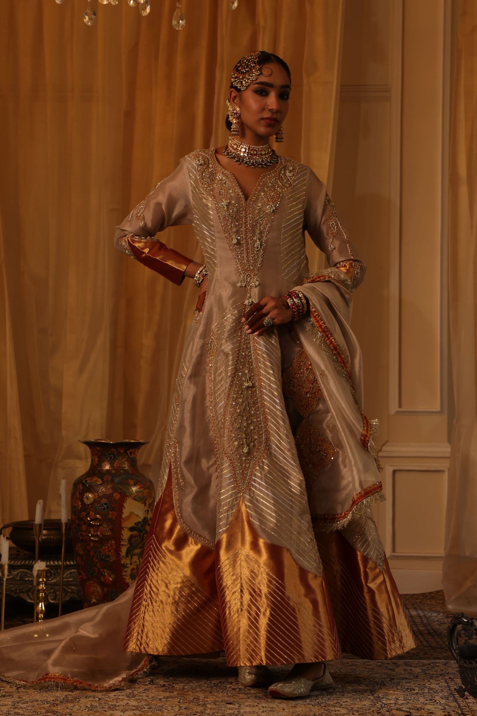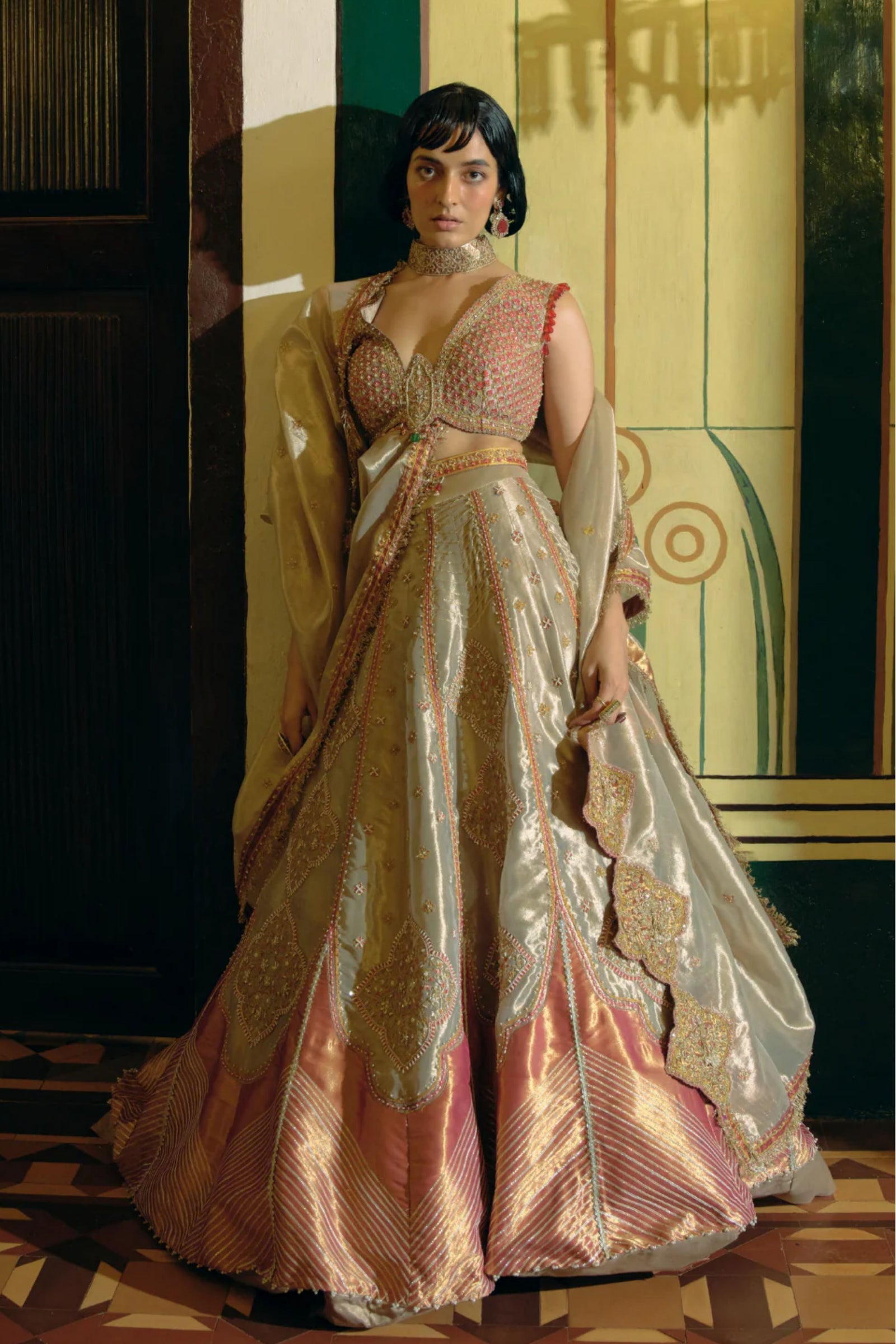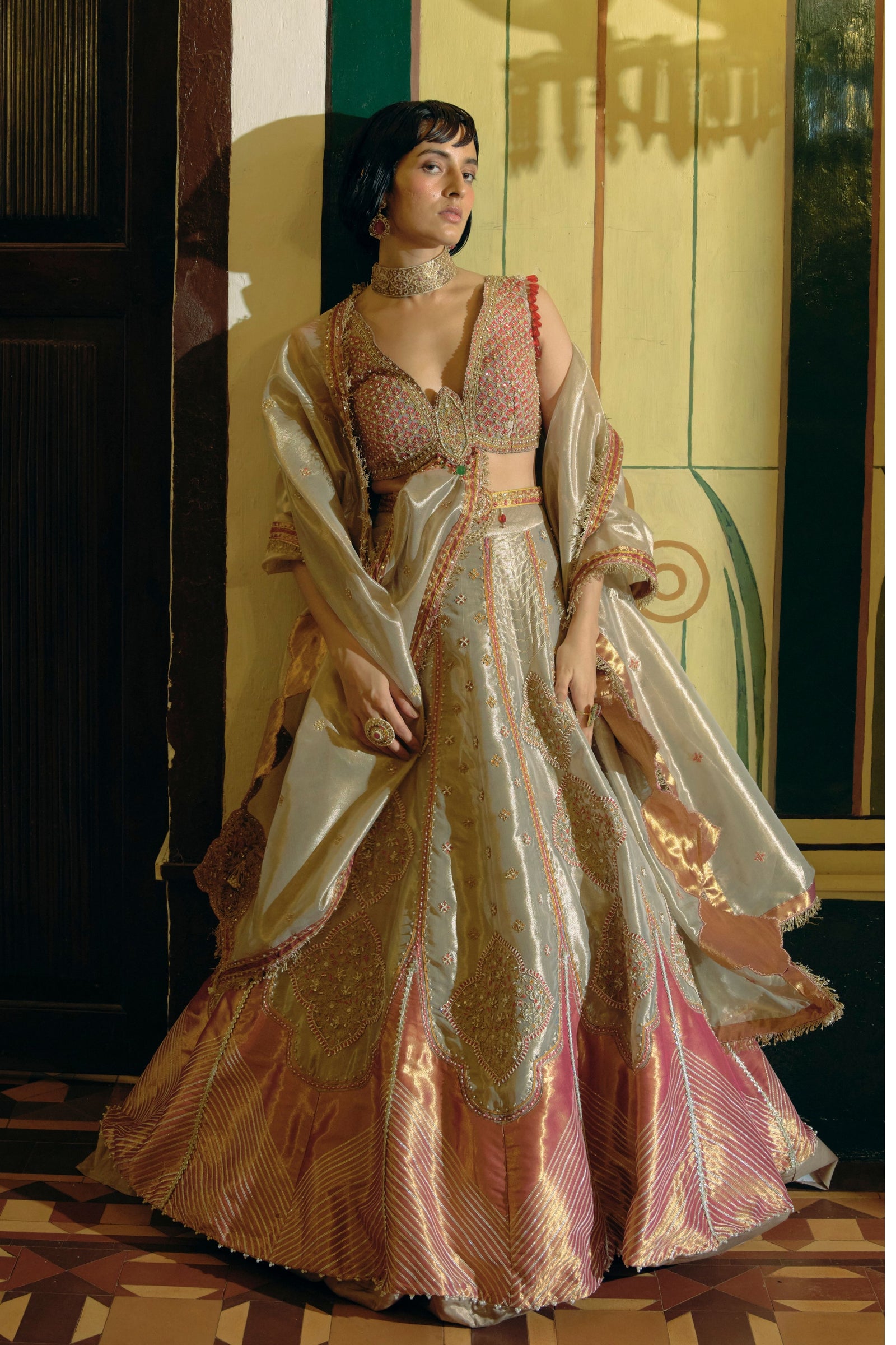 • This Kalidar lehenga set in purple silk zari tissue and Jacquard silk Banarasi features Jharokha-inspired panels,elongated paisley embroidery, and intricate embellishments. The ensemble includes a purple tissue embroidered elbow sleeve blouse and dupatta with paisley embroidery and pearl details.