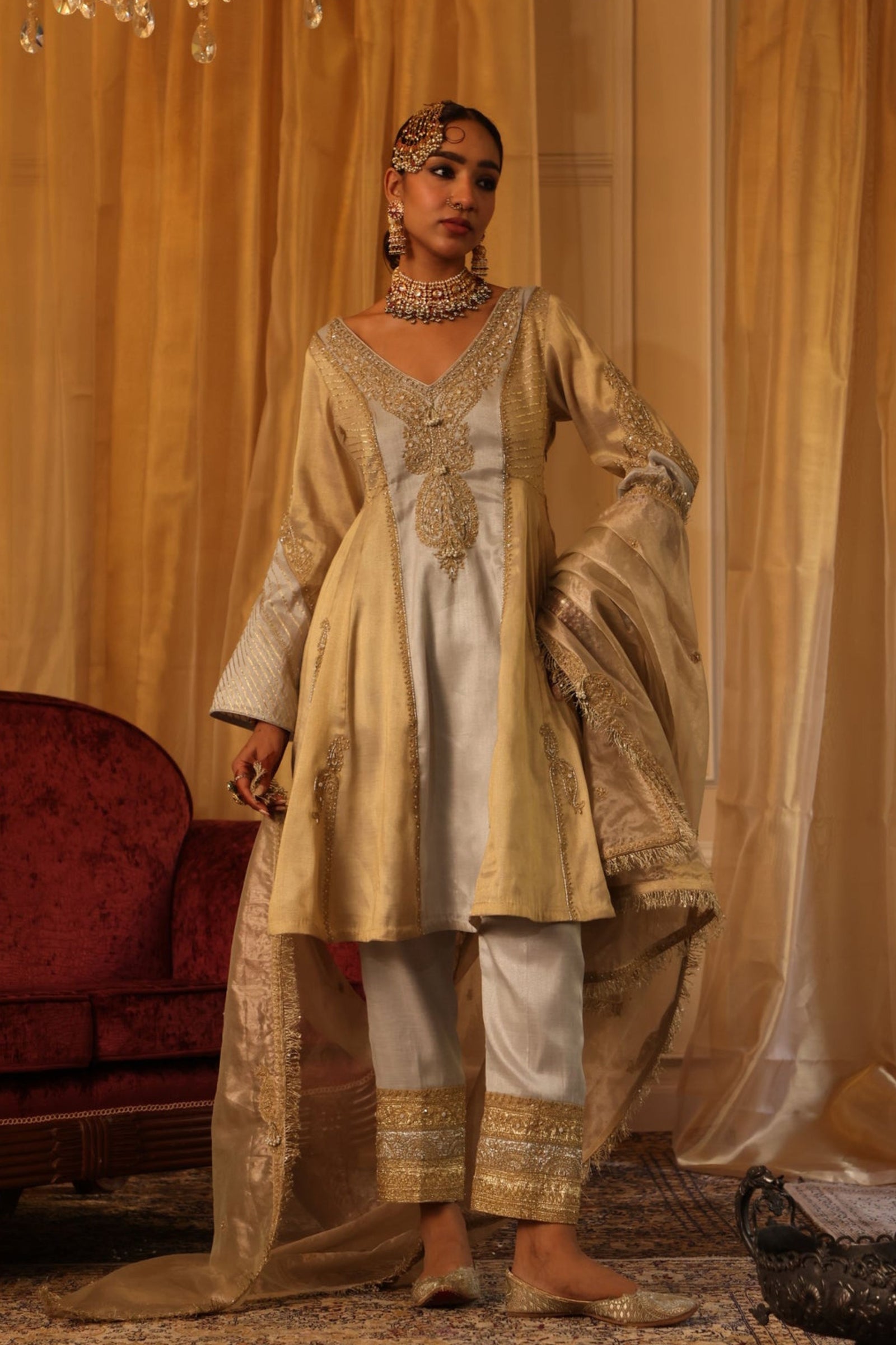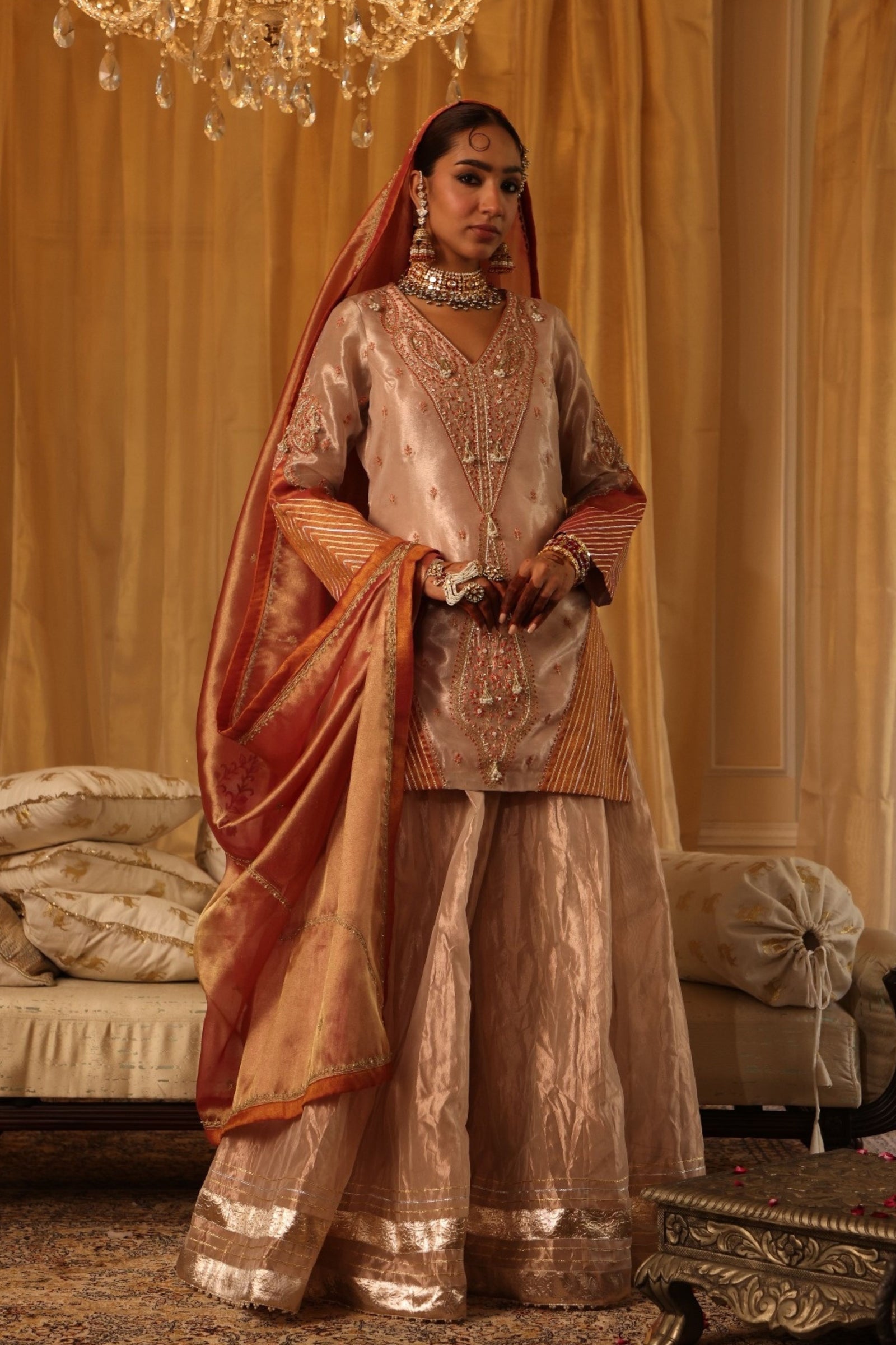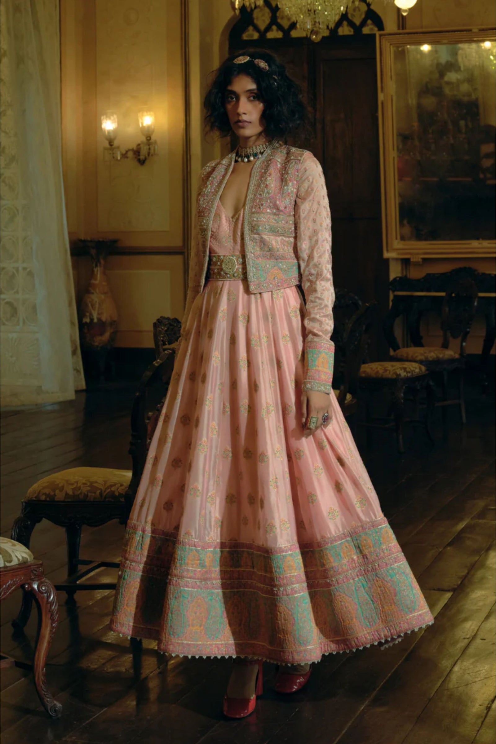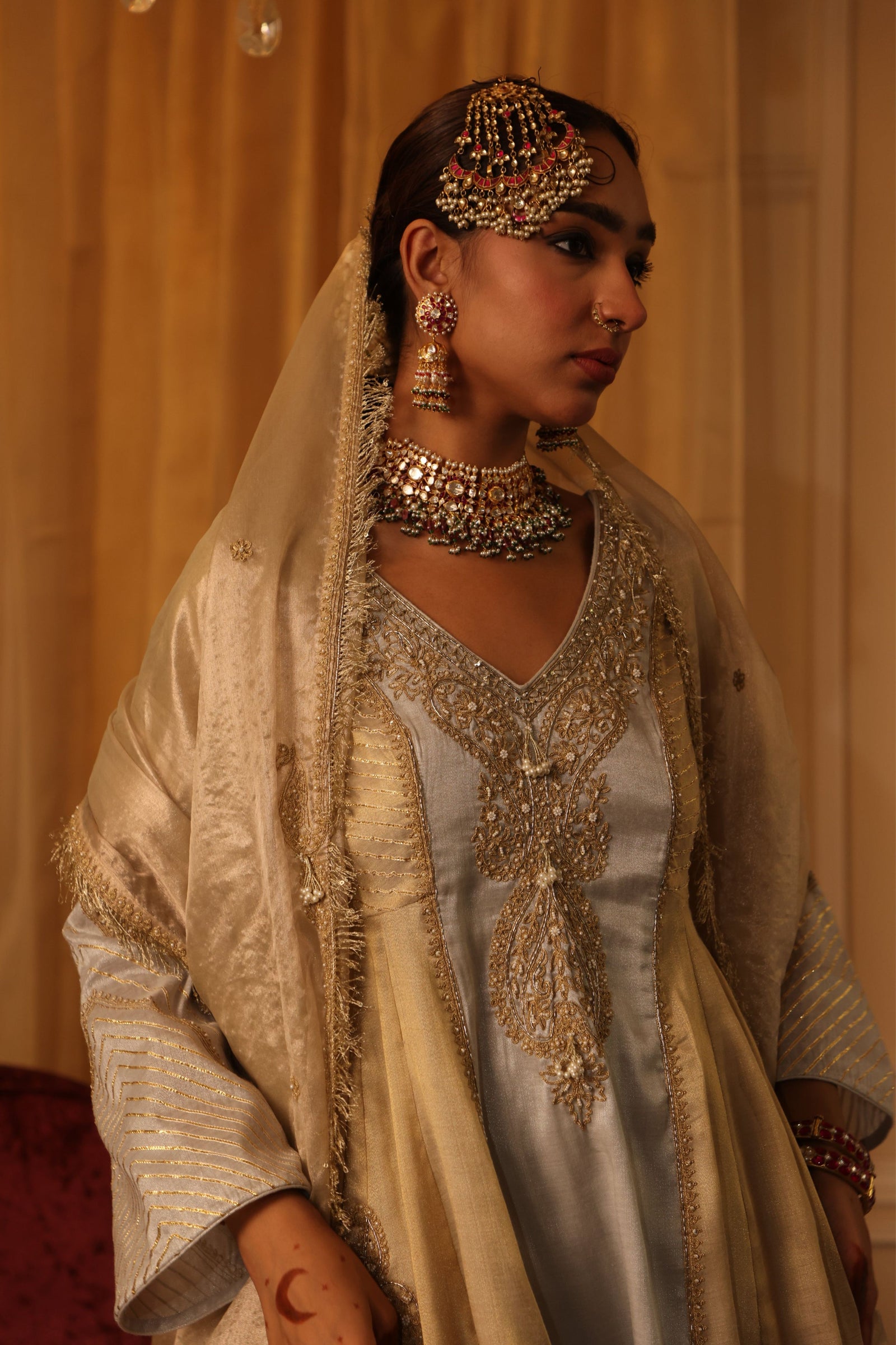 • This Kalidar lehenga set in purple silk zari tissue and Jacquard silk Banarasi features Jharokha-inspired panels,elongated paisley embroidery, and intricate embellishments. The ensemble includes a purple tissue embroidered elbow sleeve blouse and dupatta with paisley embroidery and pearl details.