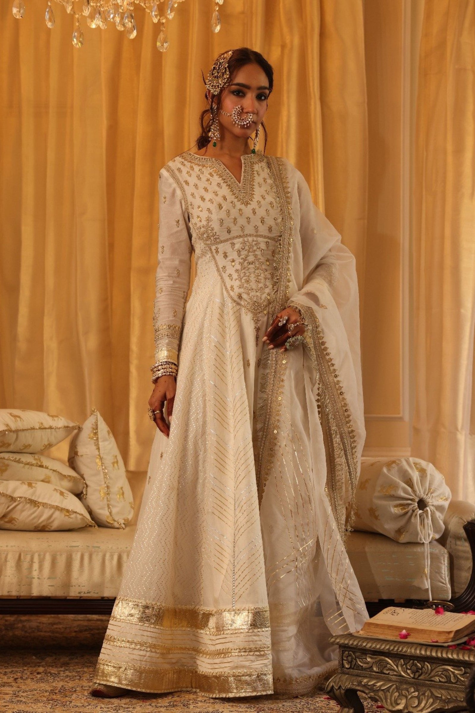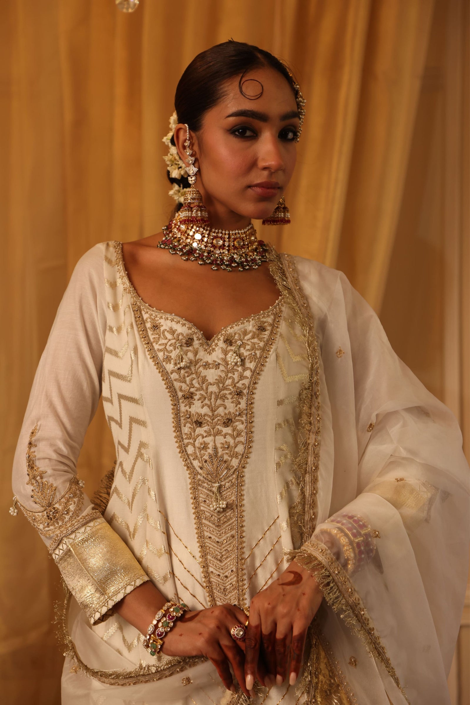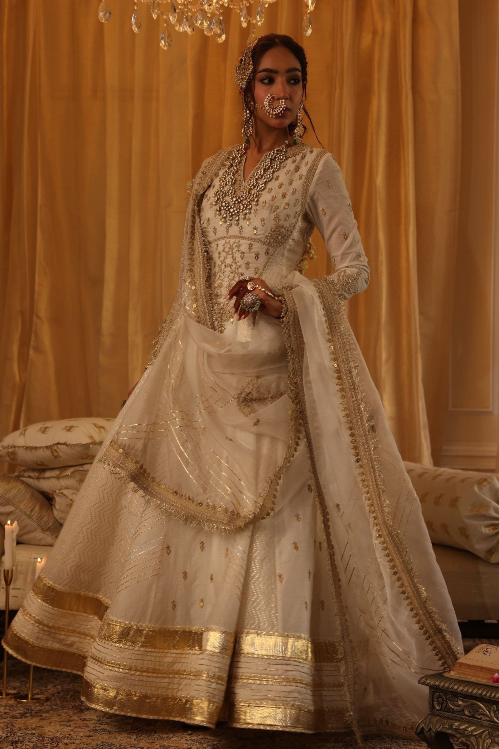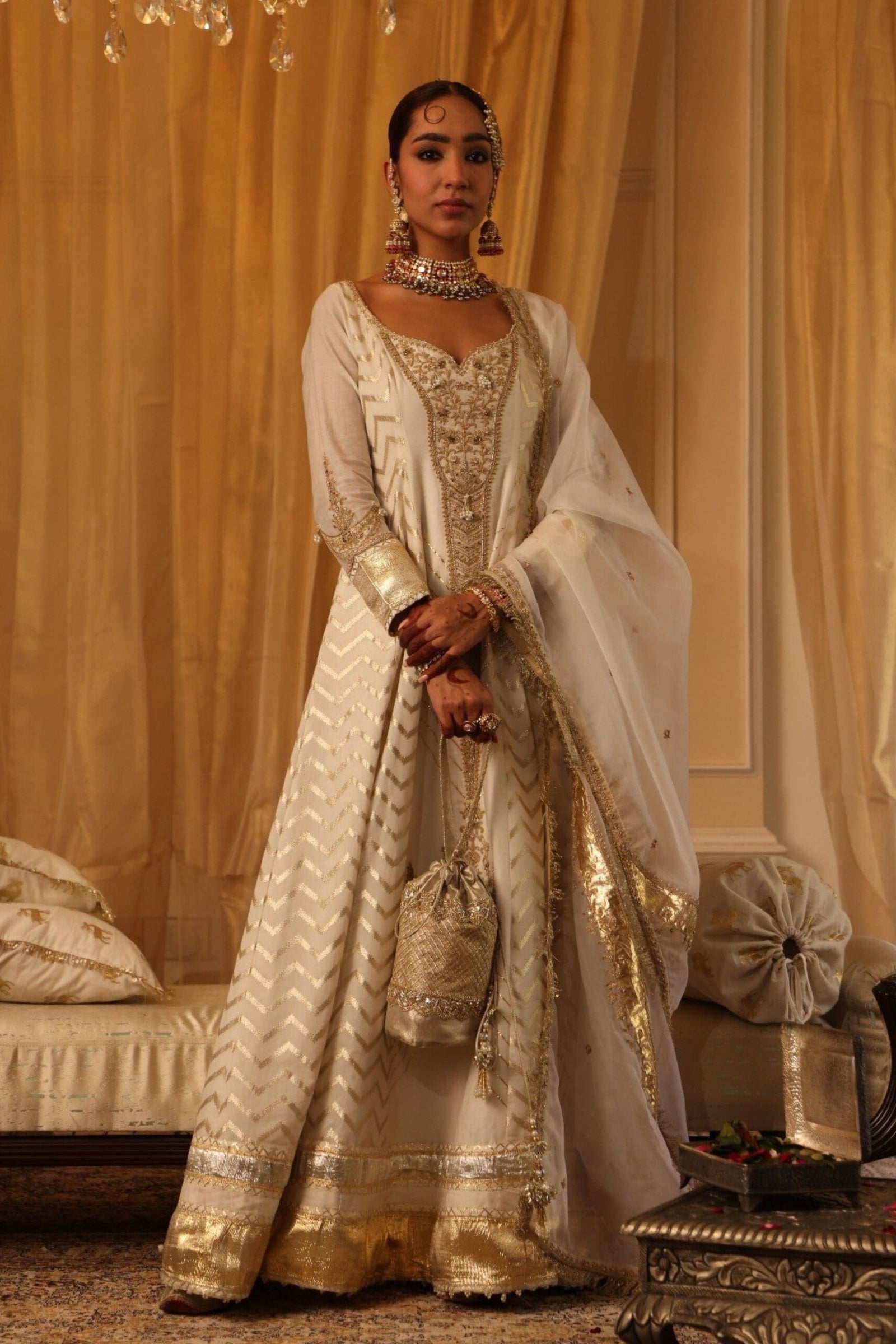 • This Kalidar lehenga set in purple silk zari tissue and Jacquard silk Banarasi features Jharokha-inspired panels,elongated paisley embroidery, and intricate embellishments. The ensemble includes a purple tissue embroidered elbow sleeve blouse and dupatta with paisley embroidery and pearl details.
