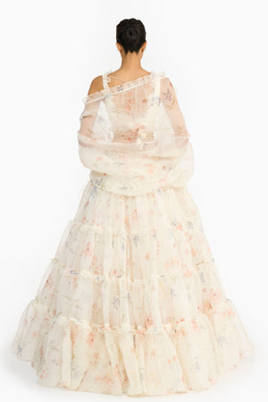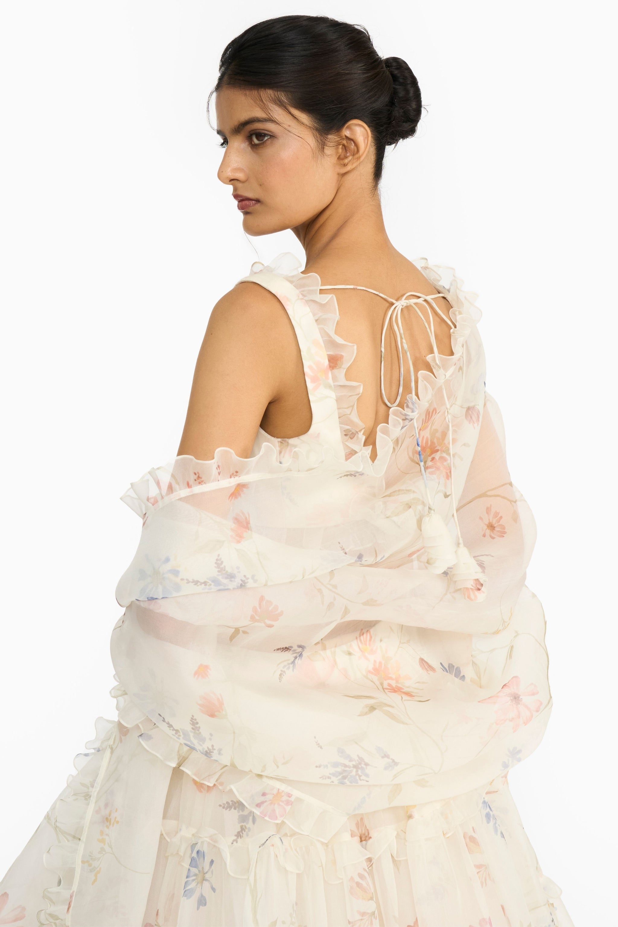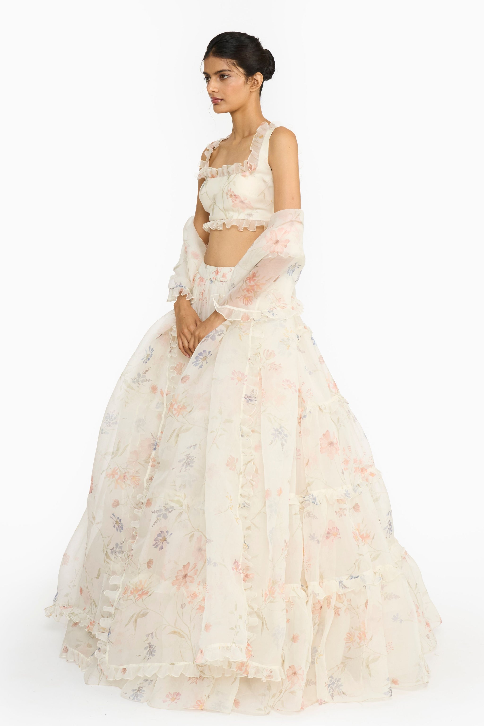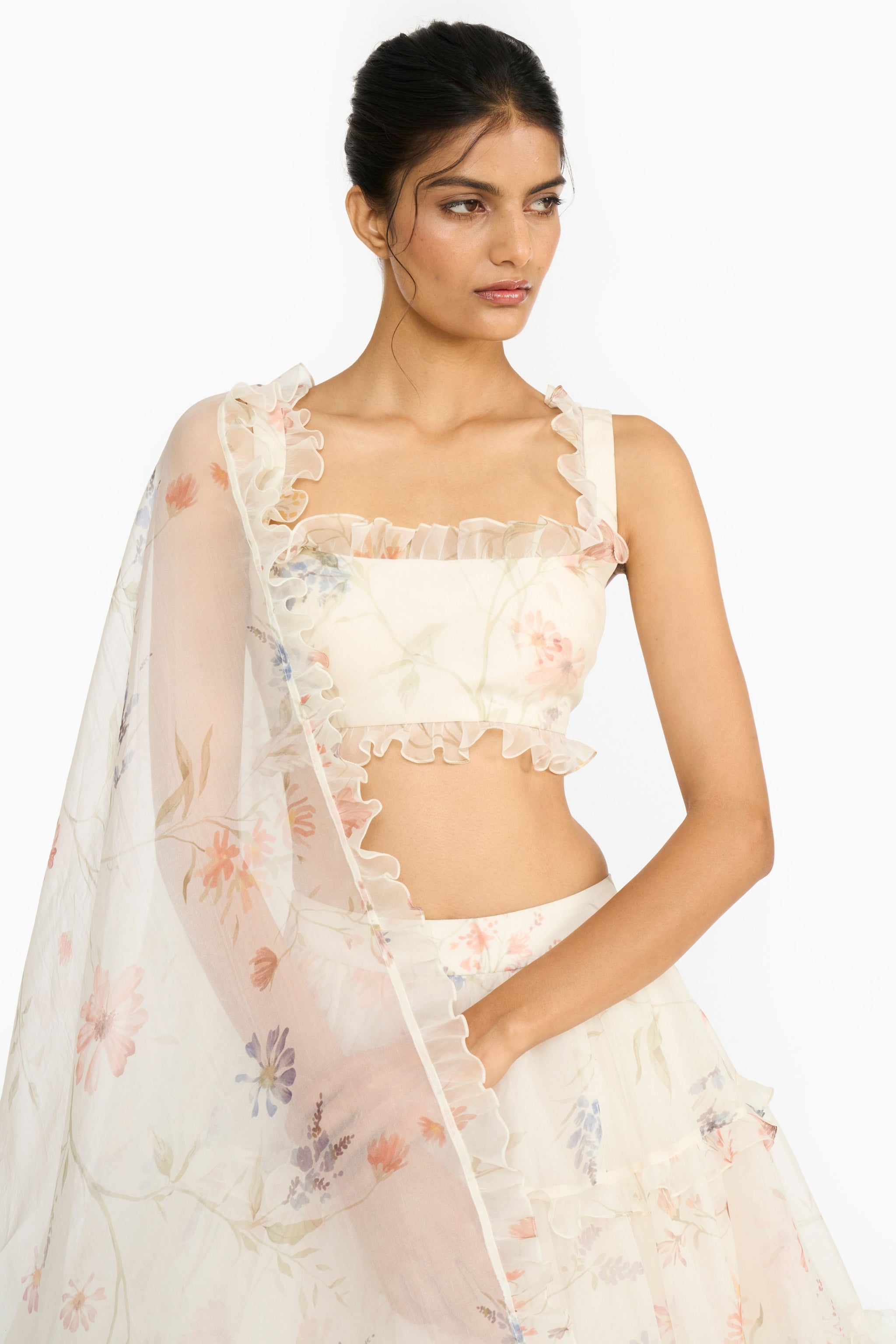 • Blue & peach printed lehenga paired with ruffled blouse and dupatta.