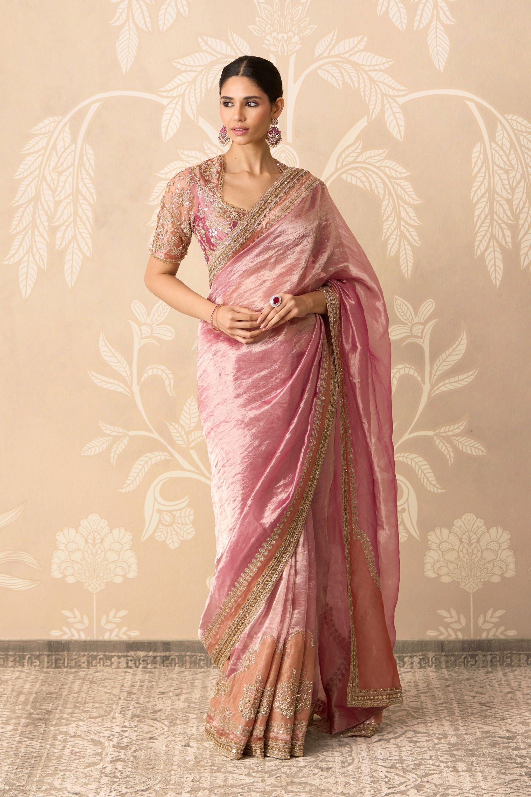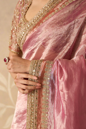 • Tissue embroidered blouse with tissue embroidered flat saree and crepe petticoat
