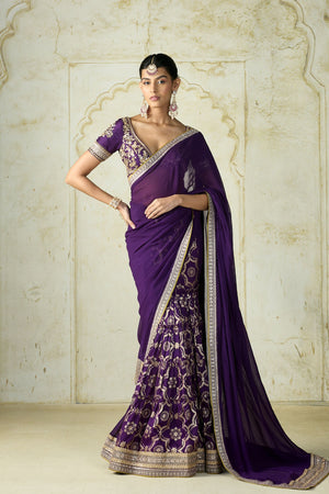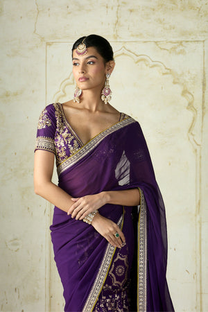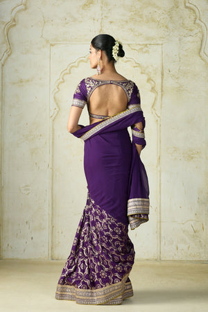 • This regal saree exudes timeless elegance with its rich fabric and intricately embroidered details. The blouse is heavily embellished perfectly complementing the saree. The drape flows gracefully, showcasing a beautifully embroidered lower half with elaborate patterns that add depth and grandeur.