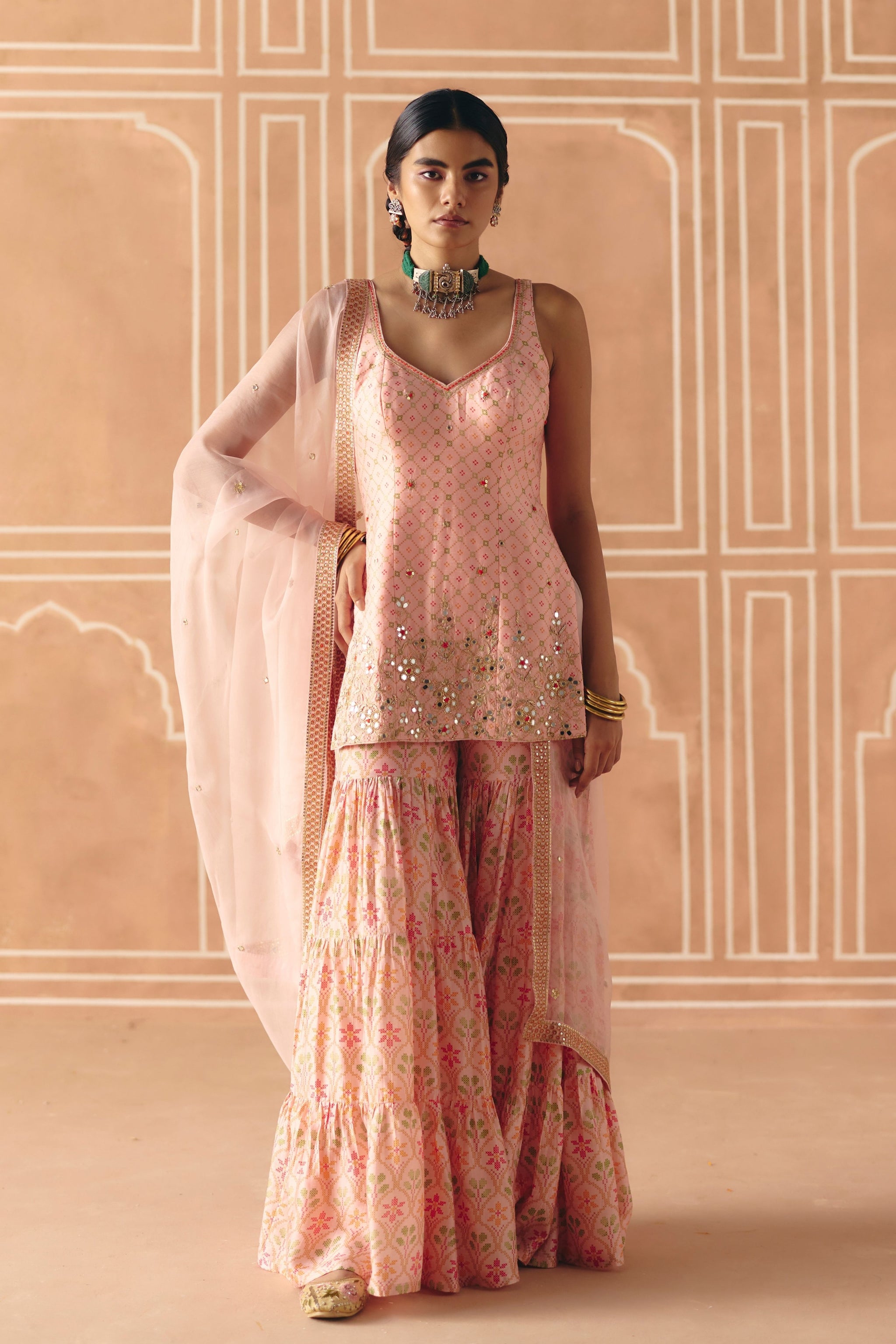 • Featuring a printed, hand embroidered tunic paired with a printed sharara and an embroidered organza dupatta.