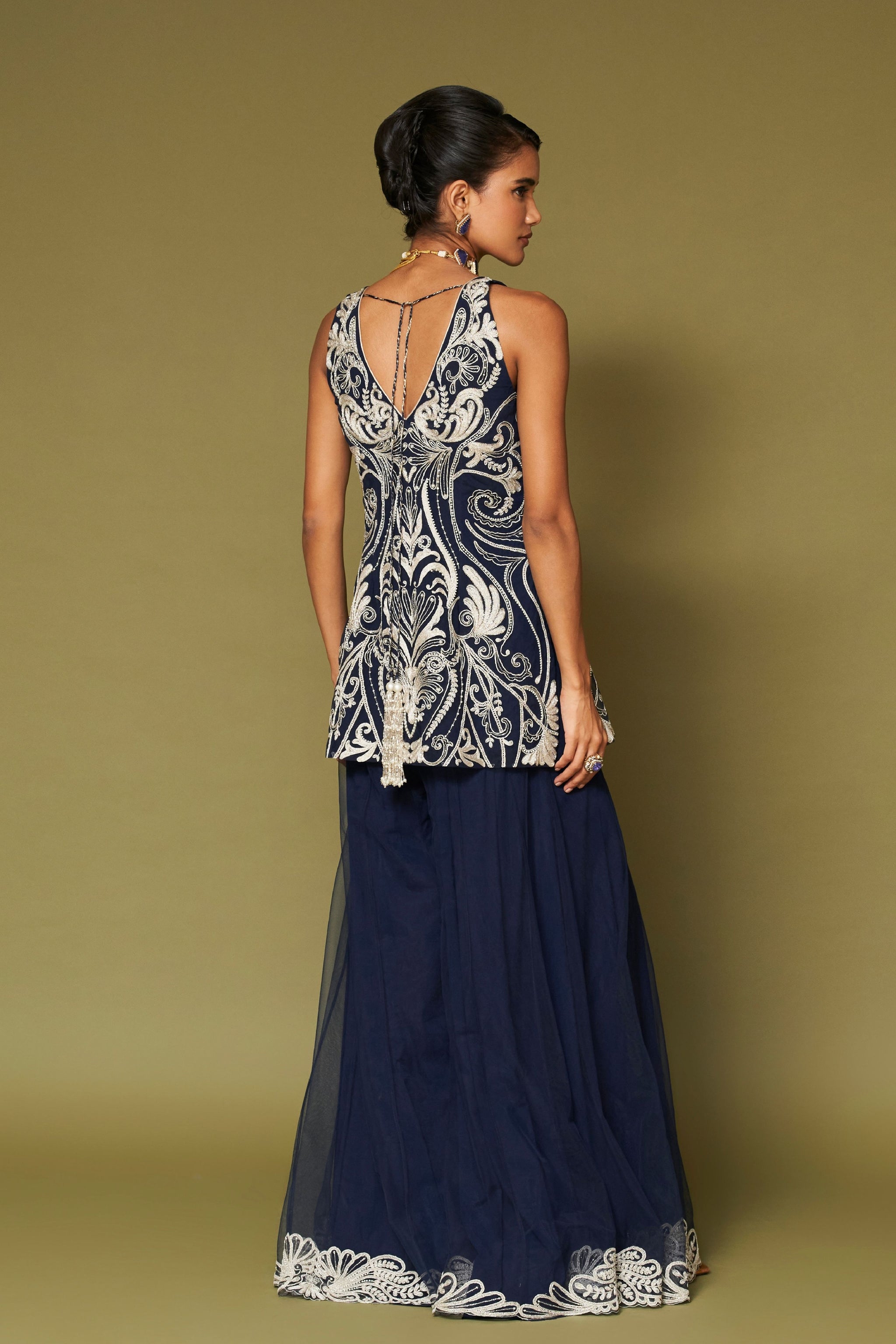 • Crafted in delicate sheer net, this midnight navy sharara set features a fully embellished short kurta paired with a matching sharara. Intricately adorned with fine zari work and exquisite hand embroidery, the look is completed with a beautifully embellished net dupatta that adds a touch of regal elegance to the ensemble.
