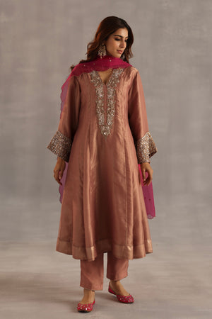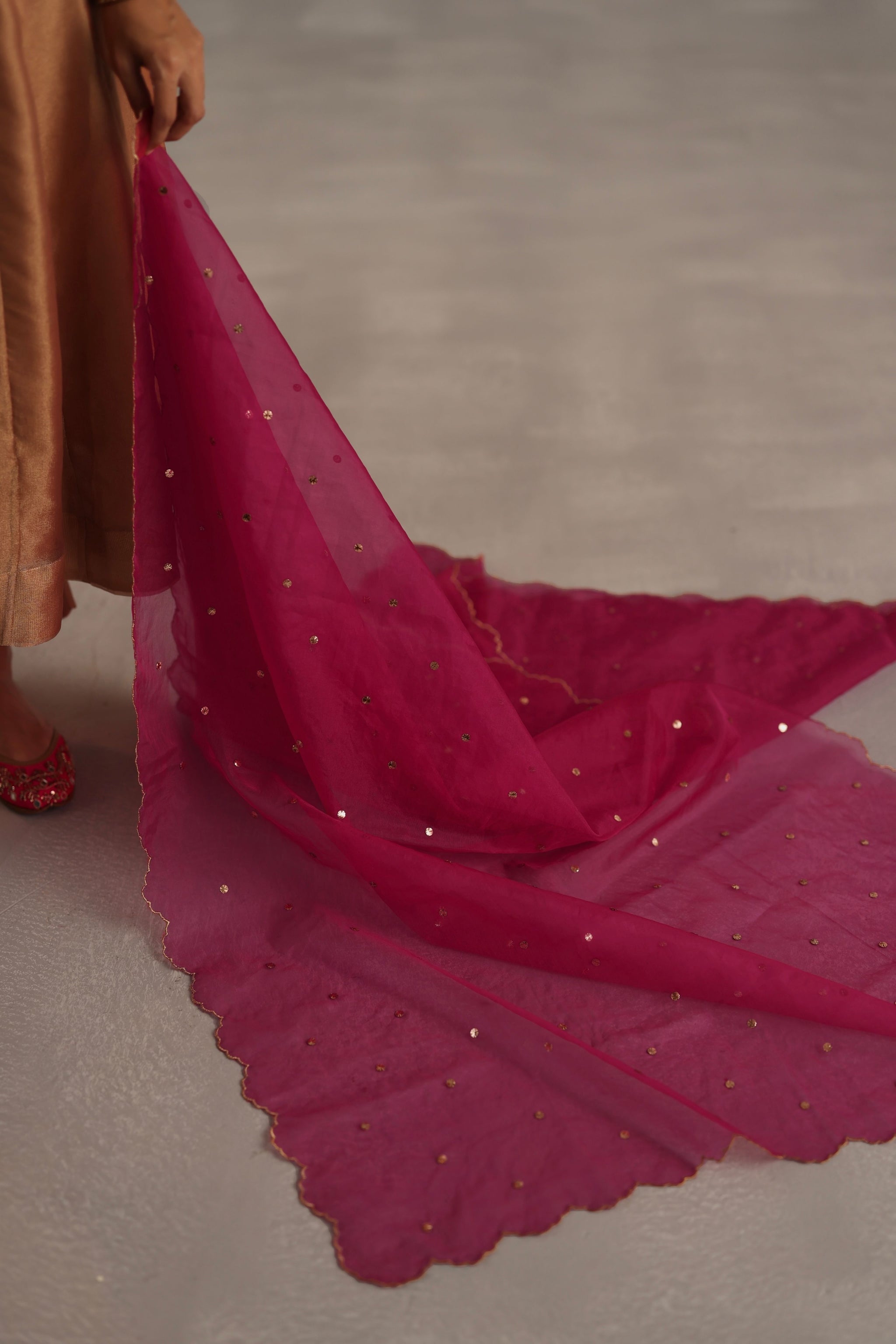 • An orange kurta set featuring intricate mukaish, tilla, sequins, dabka, and zari handwork on the yoke and cuffs. The kurta and pants are finished with delicate gota on the hems, while the rani pink dupatta stands out with mukaish bootis and a finely detailed zari scalloped border, bringing a perfect blend of radiance and tradition.