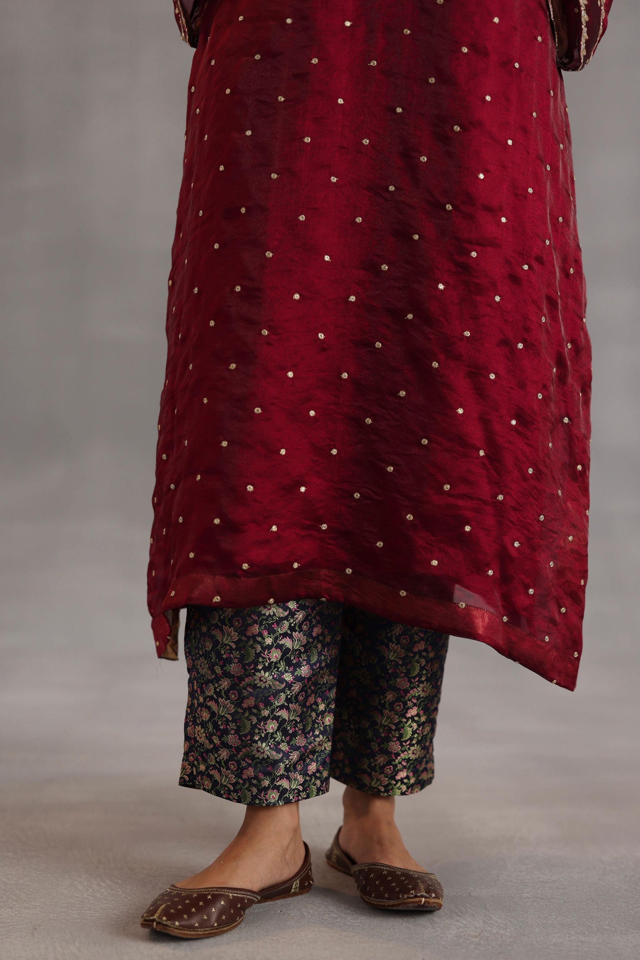 • This phiran set features a flattering v-neckline accentuated with intricate gota patti, dabka, and zari embroidery on the yoke and cuffs with zari and sequins work on the kurta. The cuffs mirror this artistry with delicate gota patti highlights.