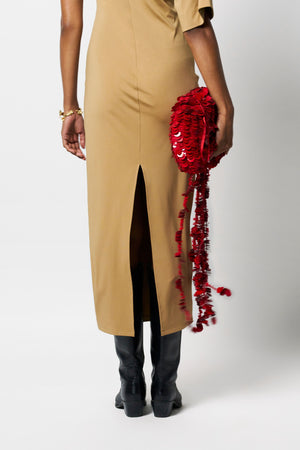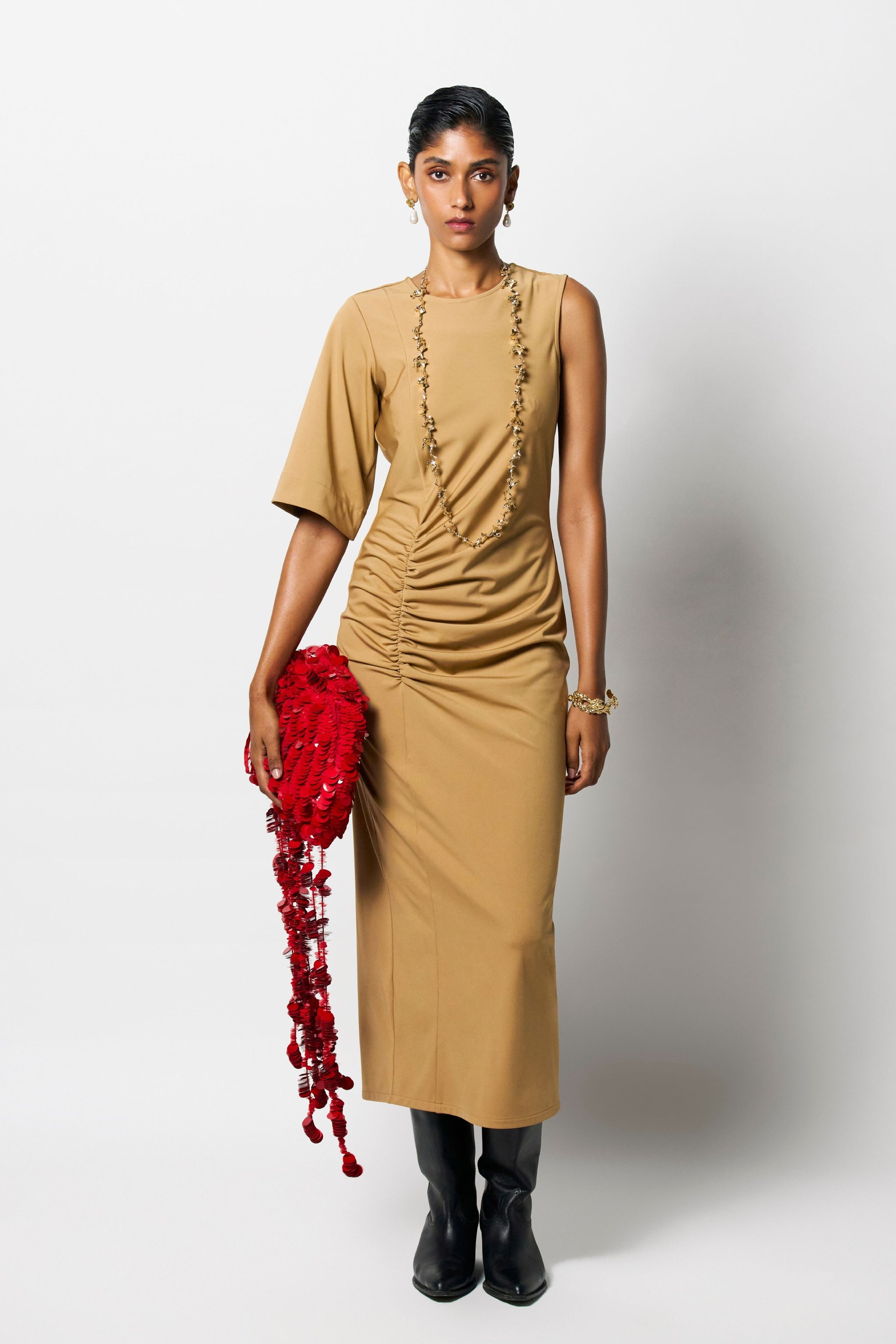 • This Pin Dress is designed in a slim fit that sits perfectly on your body. Made from super soft jersey fabric, it features a back zipper for easy wear. The front has a stylish gathered detail, and the unique one-sided sleeve design adds an elegant touch to your look.
