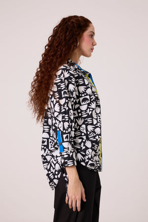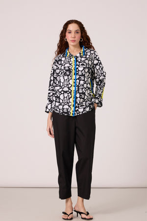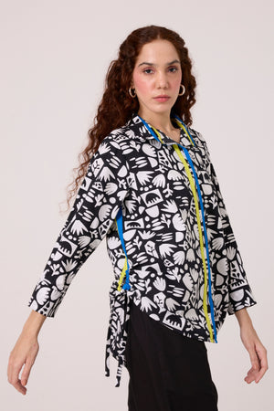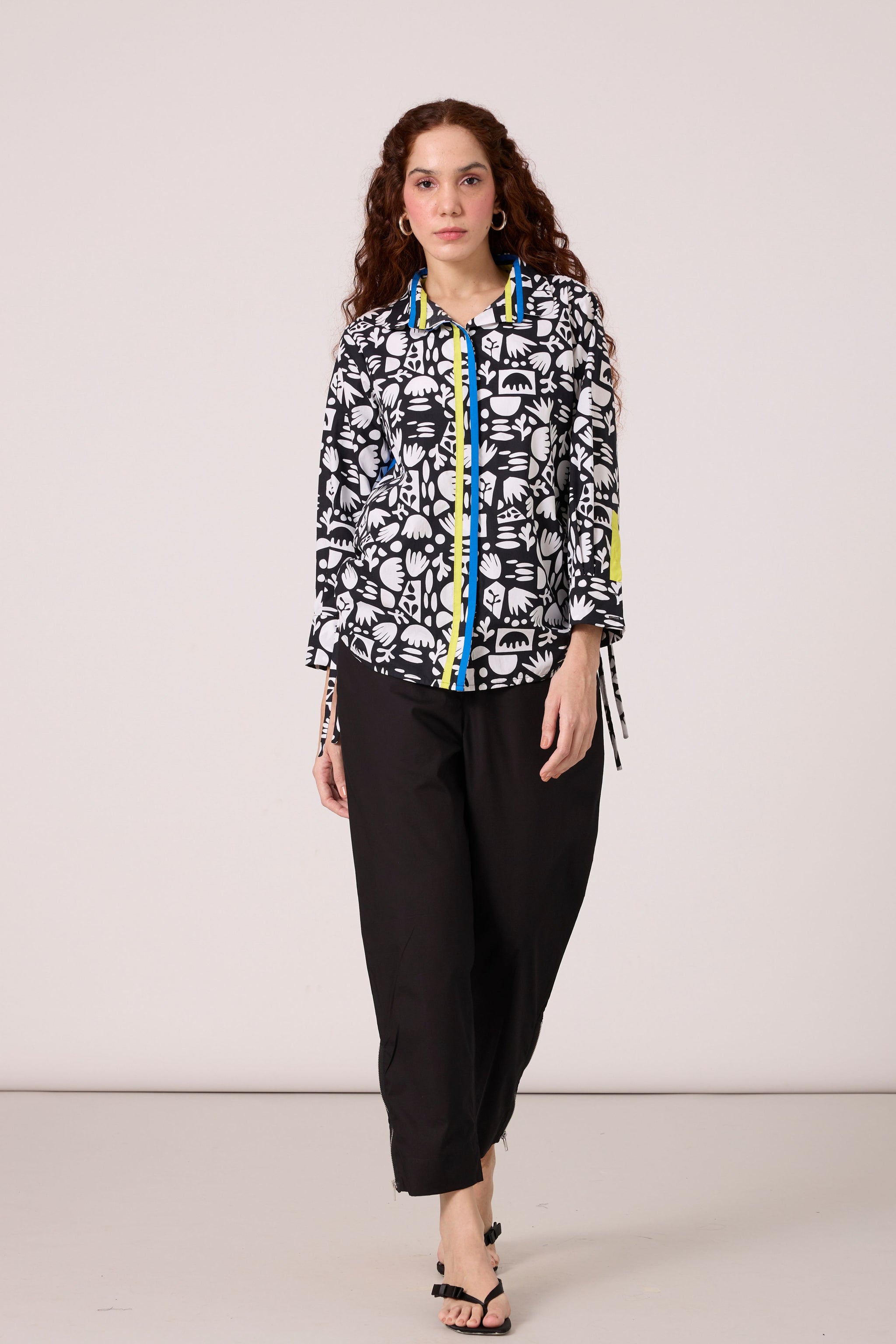 • A dual-tone shirt with contrast tape detail at the placket and collar, and rouched keyhole detailing at the sides.