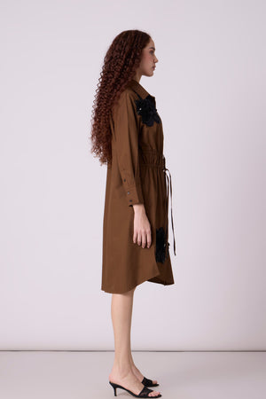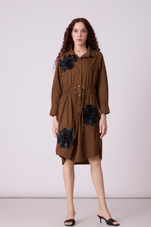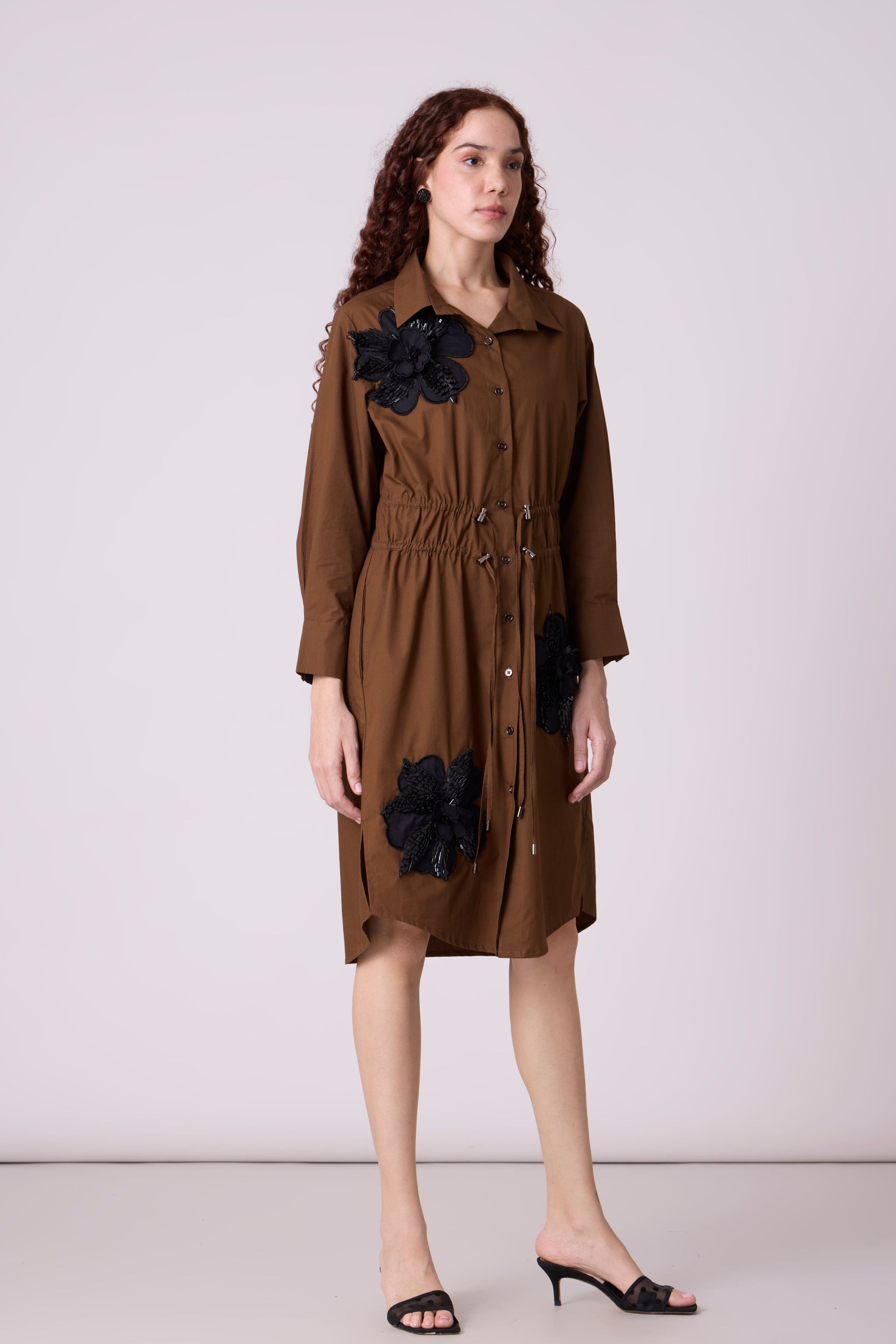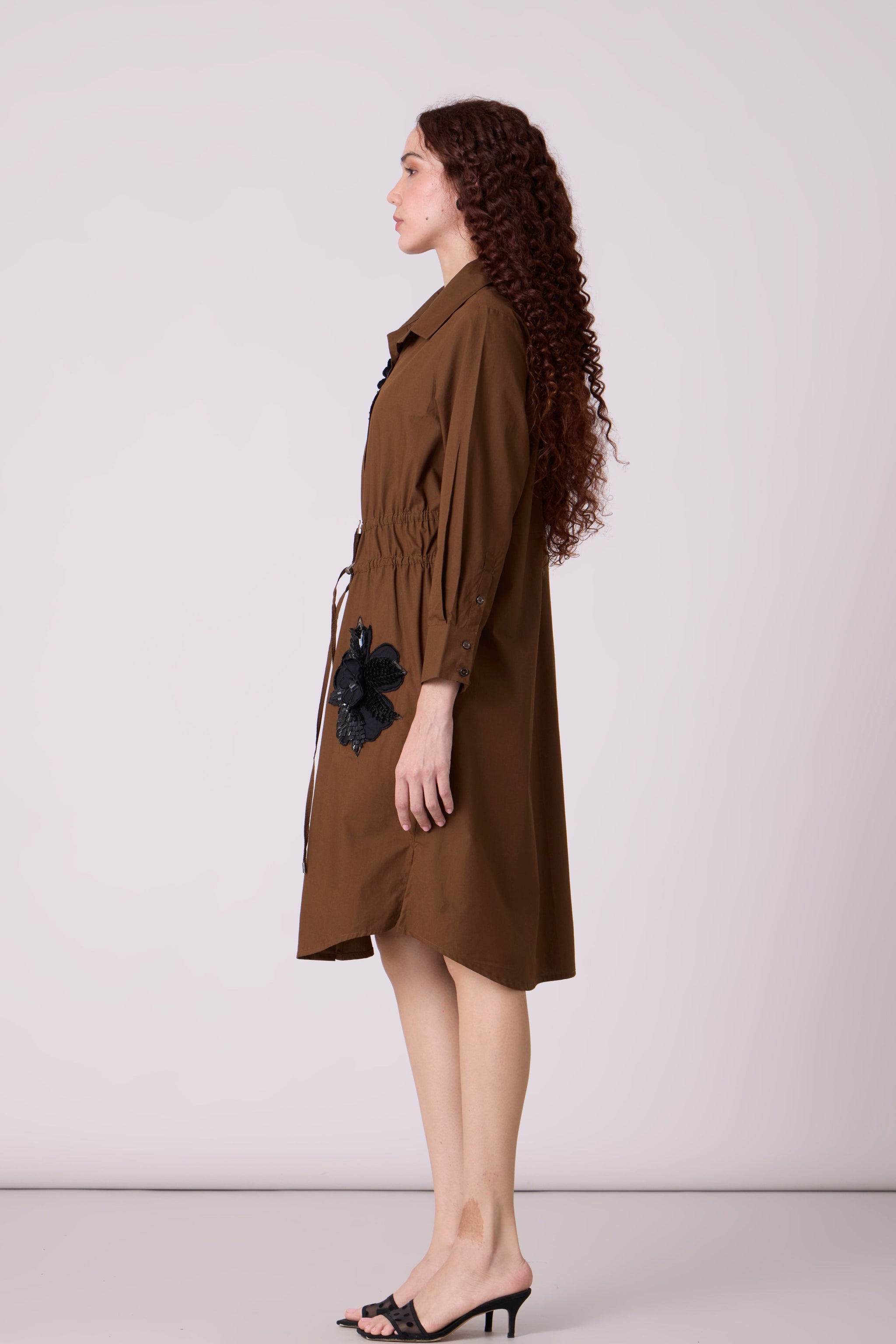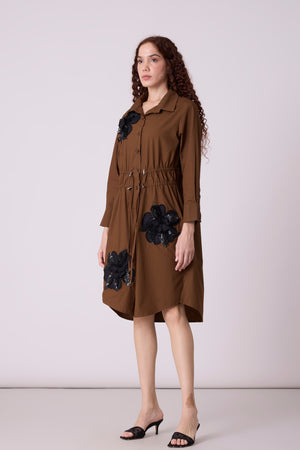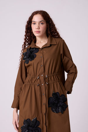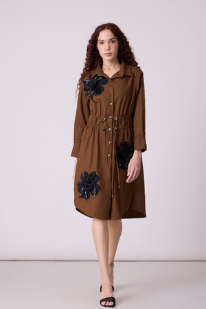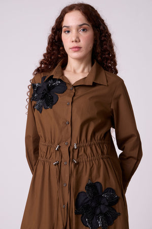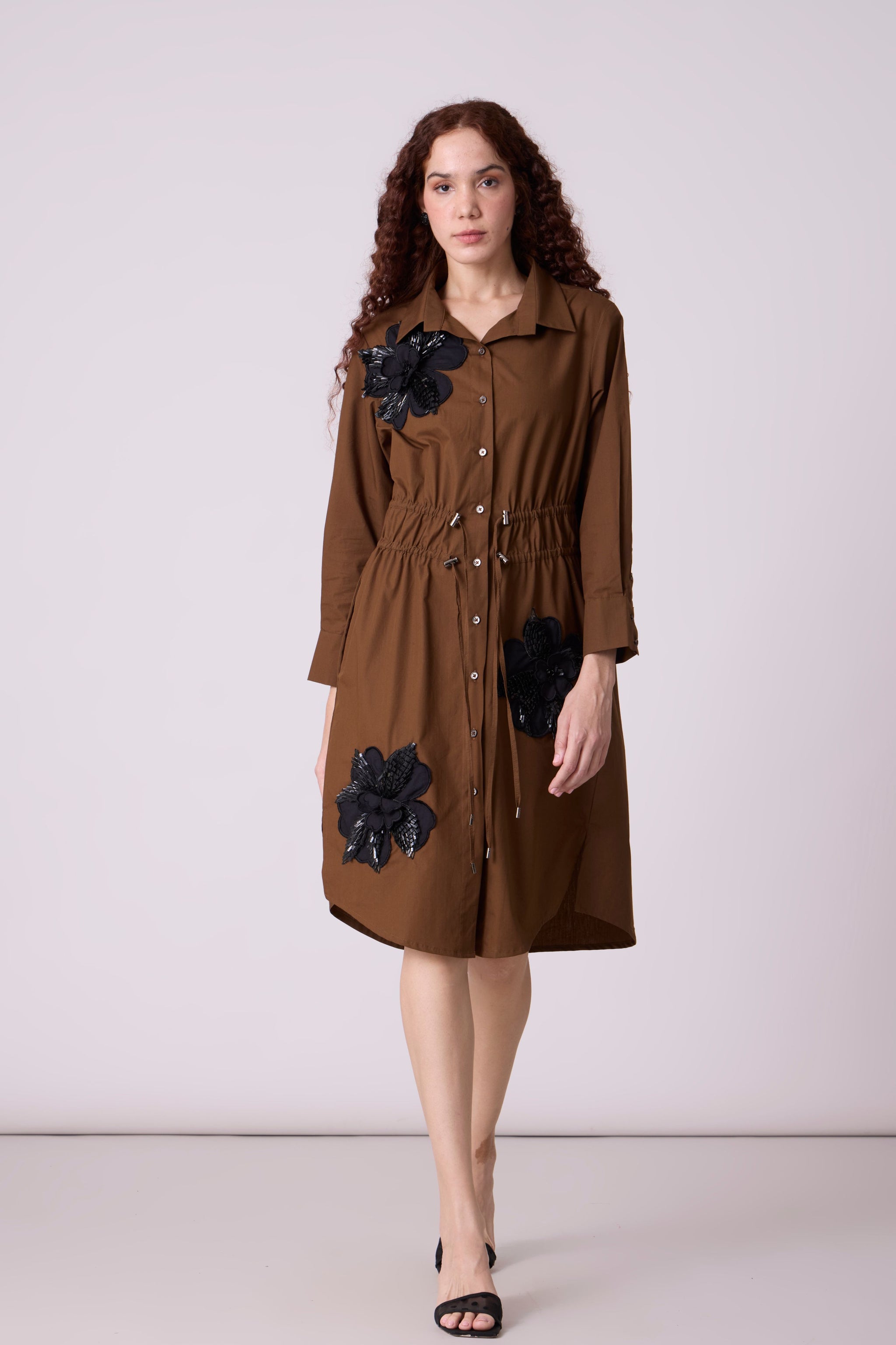 • Elegant shirt dress featuring adjustable drawstrings at the waist for a perfect fit - adorned with 3d floral sequin patches for a dressier look