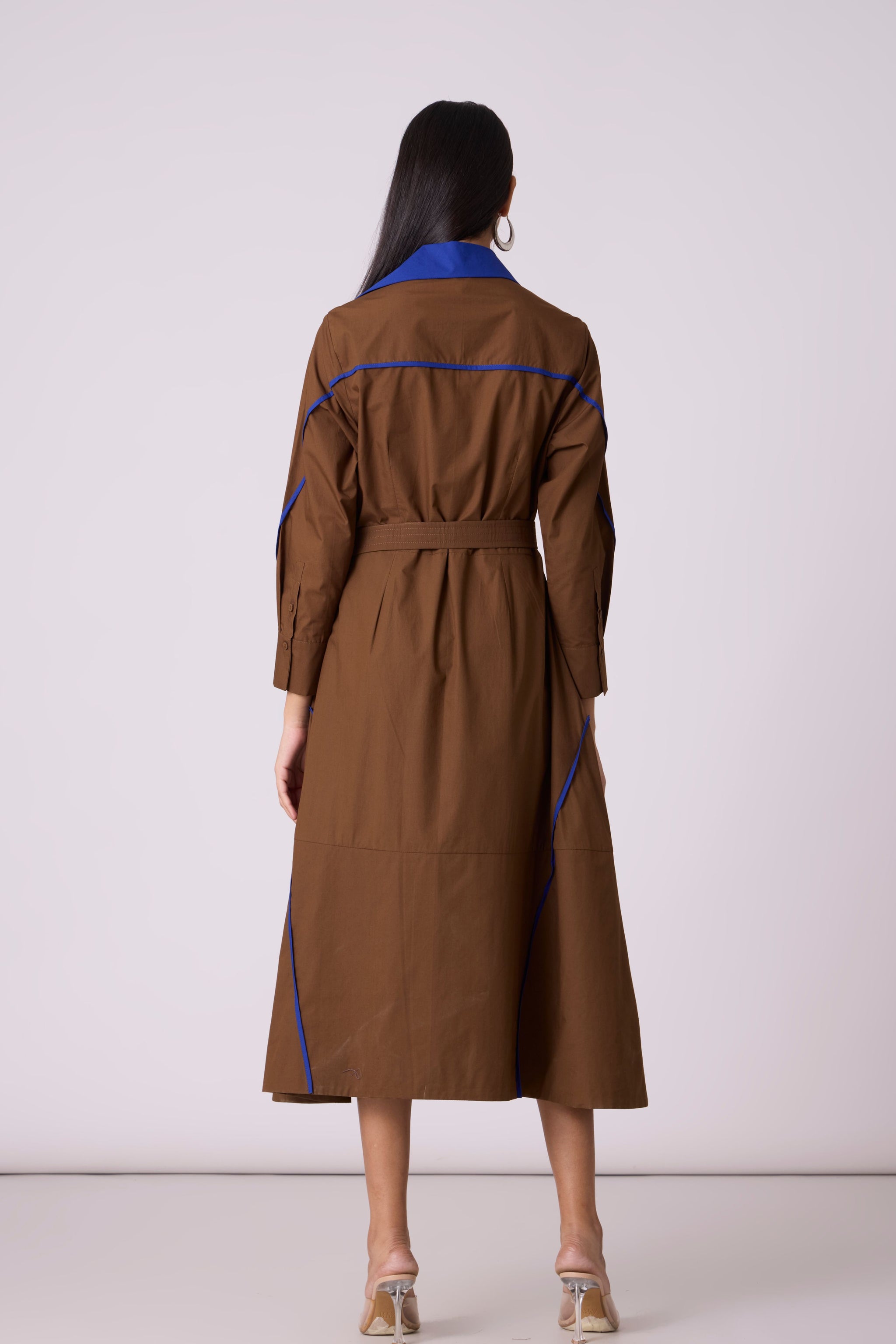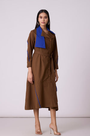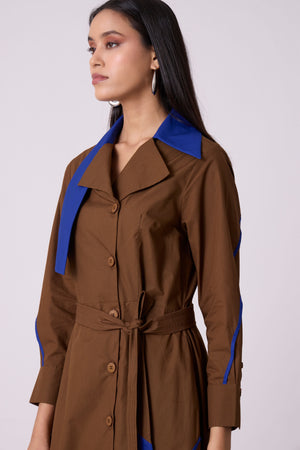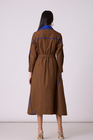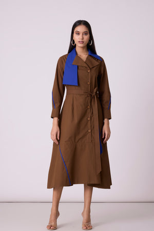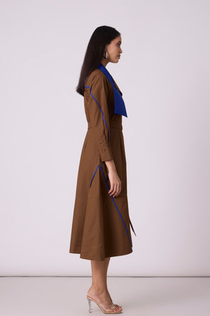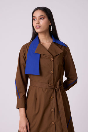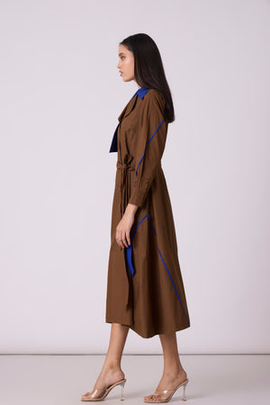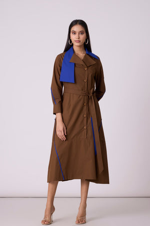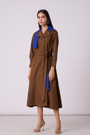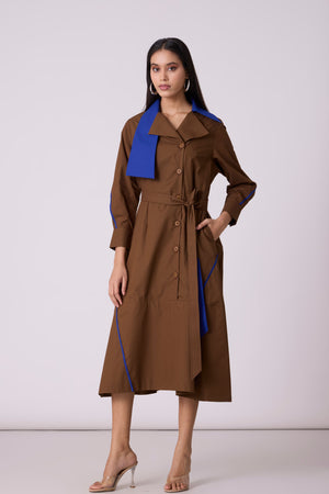 • A tailored a-line dress, an anlogue to the smart trench - enhanced by a wide contrast colour statement collar and thin contrast colour hand stitched tape detail on the skirt. Comes with a belt.