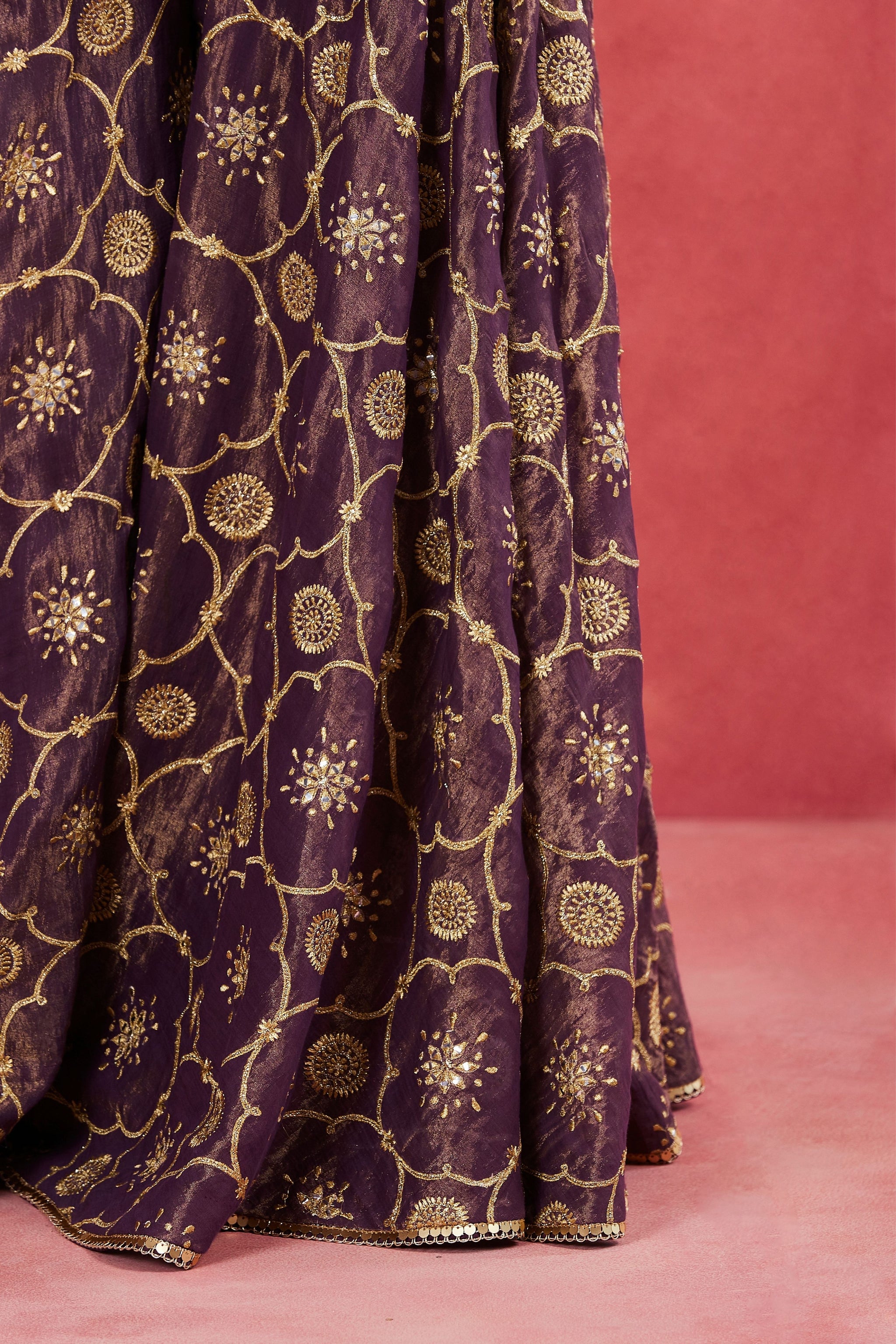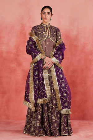 • A dark purple sharara set in handwoven cotton tissue, featuring a short kurta with a stand collar, slit, and full sleeves, paired with matching sharara bottom with side pockets and a pure silk organza dupatta. The set is adorned with gold zari embroidery and patri work in floral jaal and geometric motifs. It is finished with gold lace and piping, while the dupatta is edged with gold kiran lace. This handcrafted ensemble showcases unique charm and character. It may have slight irregularities in pattern, colour, or texture, celebrating the craftsmanship and individuality of each piece. Embrace these variations as a part of the product's story, crafted with care and attention to detail.