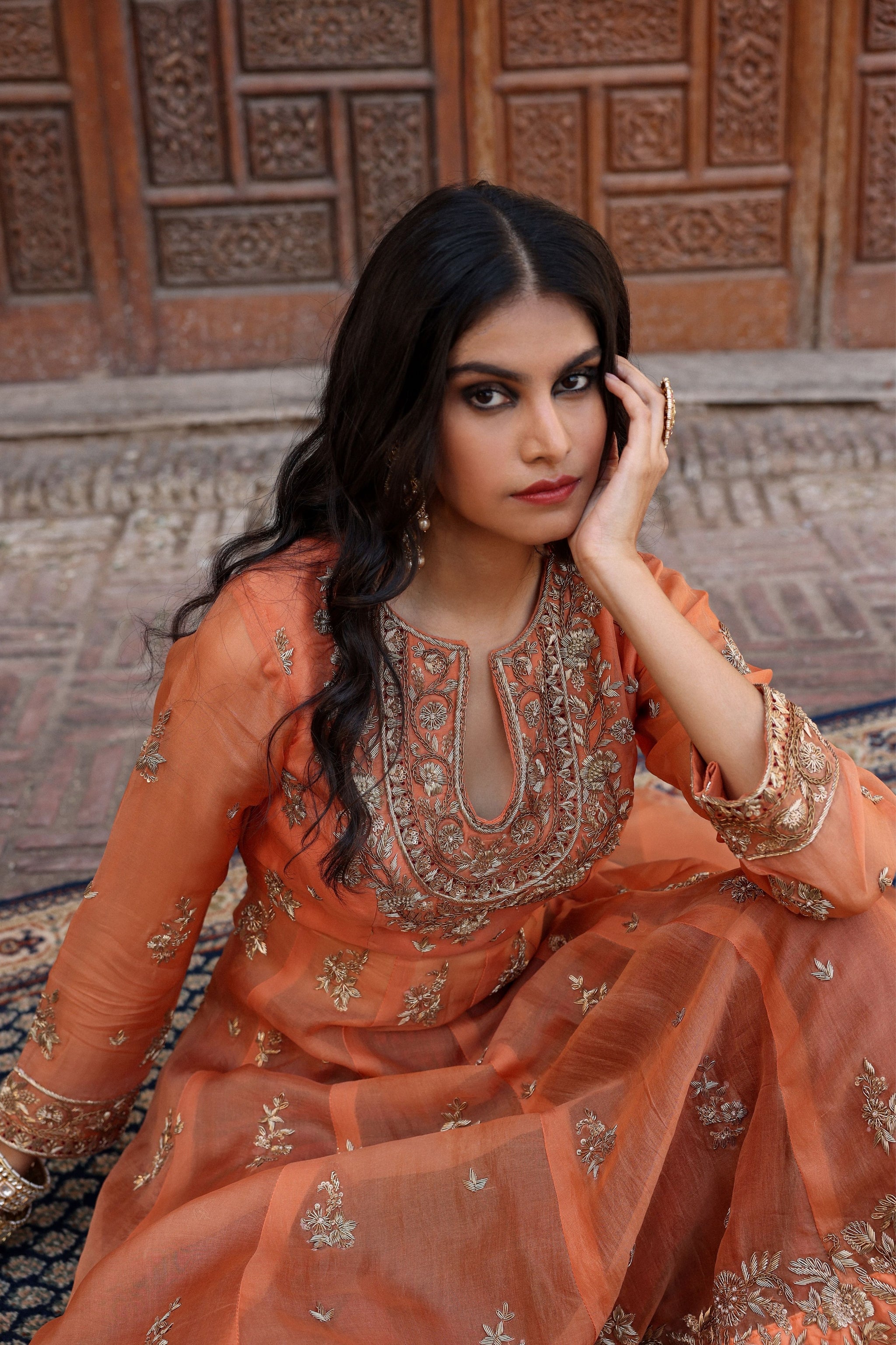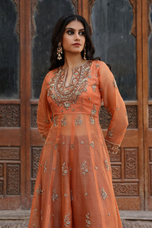 • Aftab, warmth of fading sunlight, weaves together the quiet glow of an orange anarkali paired with a maroon farshi sharara.