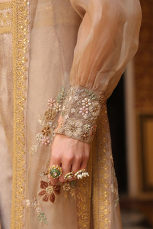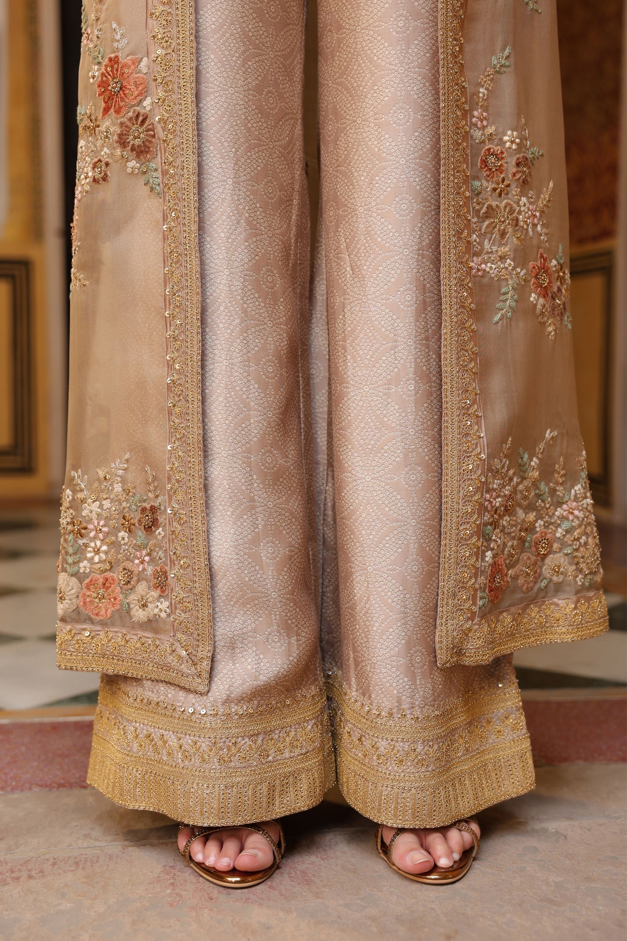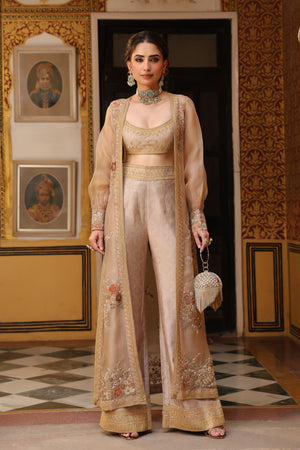 • This stylish 3-piece cape set features delicate aari embroidery enhanced with tikki and zardosi work on the cape. It is paired with a printed embroidered bustier and flared pants, creating a contemporary ensemble with traditional craftsmanship.