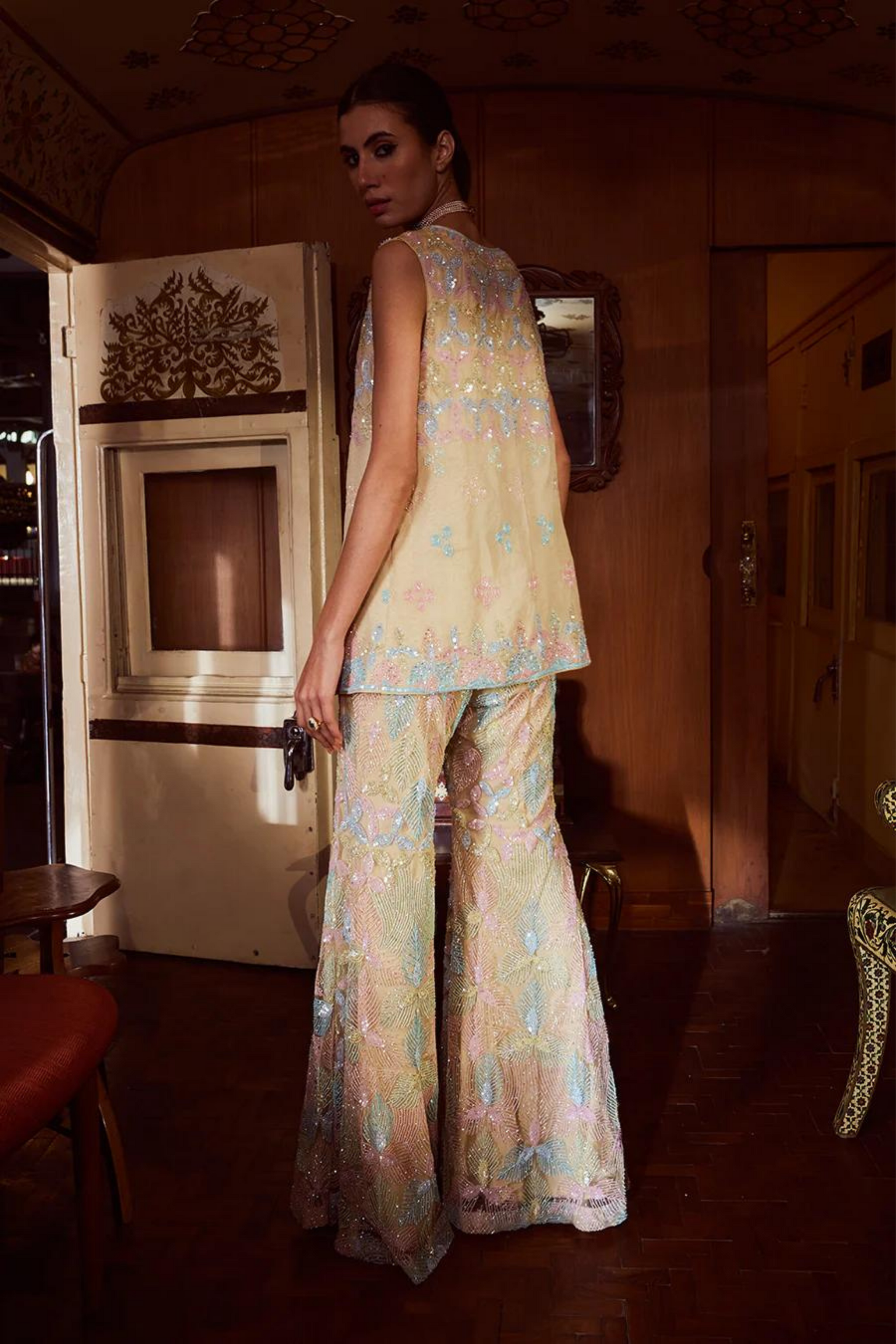 • Outlined with multicolored hand work of cutdana sequins