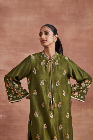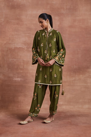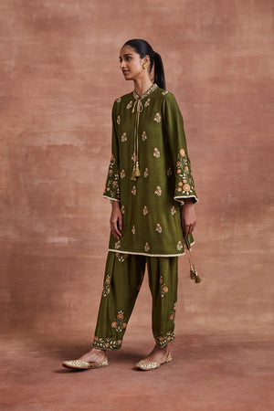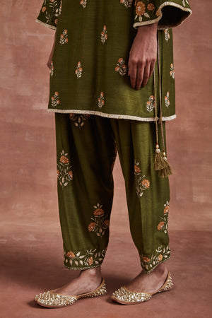 • Make a style statement with our Olive Moonga Patchwork & Zari Embroidery Shirt, featuring hand-highlighted motifs and exquisite zari embroidery. Paired with an olive moonga patchwork Pakistani salwar, this ensemble offers a blend of traditional and contemporary style.