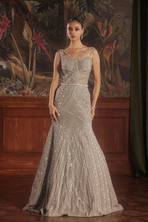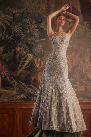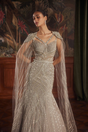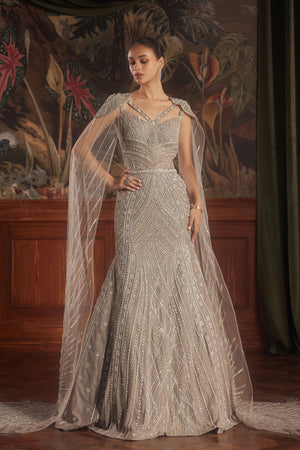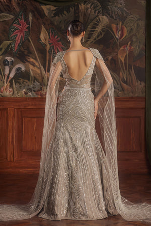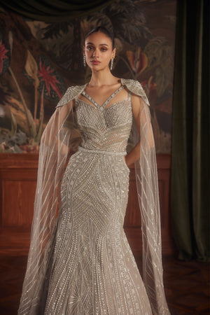 • Indulge in ethereal elegance with our enchanting ensemble. The mesmerizing mermaid gown, intricate craftsmanship with delicate embroidery, gracefully over the captivating plunge neckline. Adorned with meticulous handwork, this silver grey-hued ensemble embodies timeless beauty and artisanal craftsmanship with side cut outs. The statement gown is highlighted with dramatic shoulder pads with cape sleeves. Making it a head turner wherever you go!