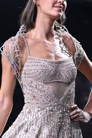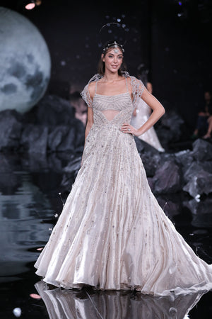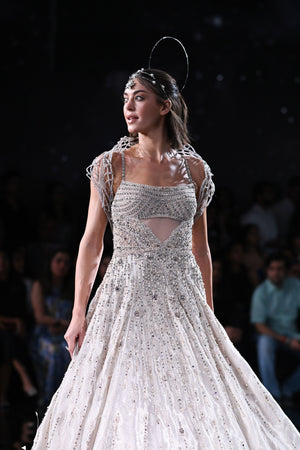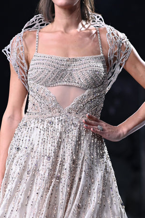 • Ivory tissue gown encrusted with crystal and pearl hand embroidery