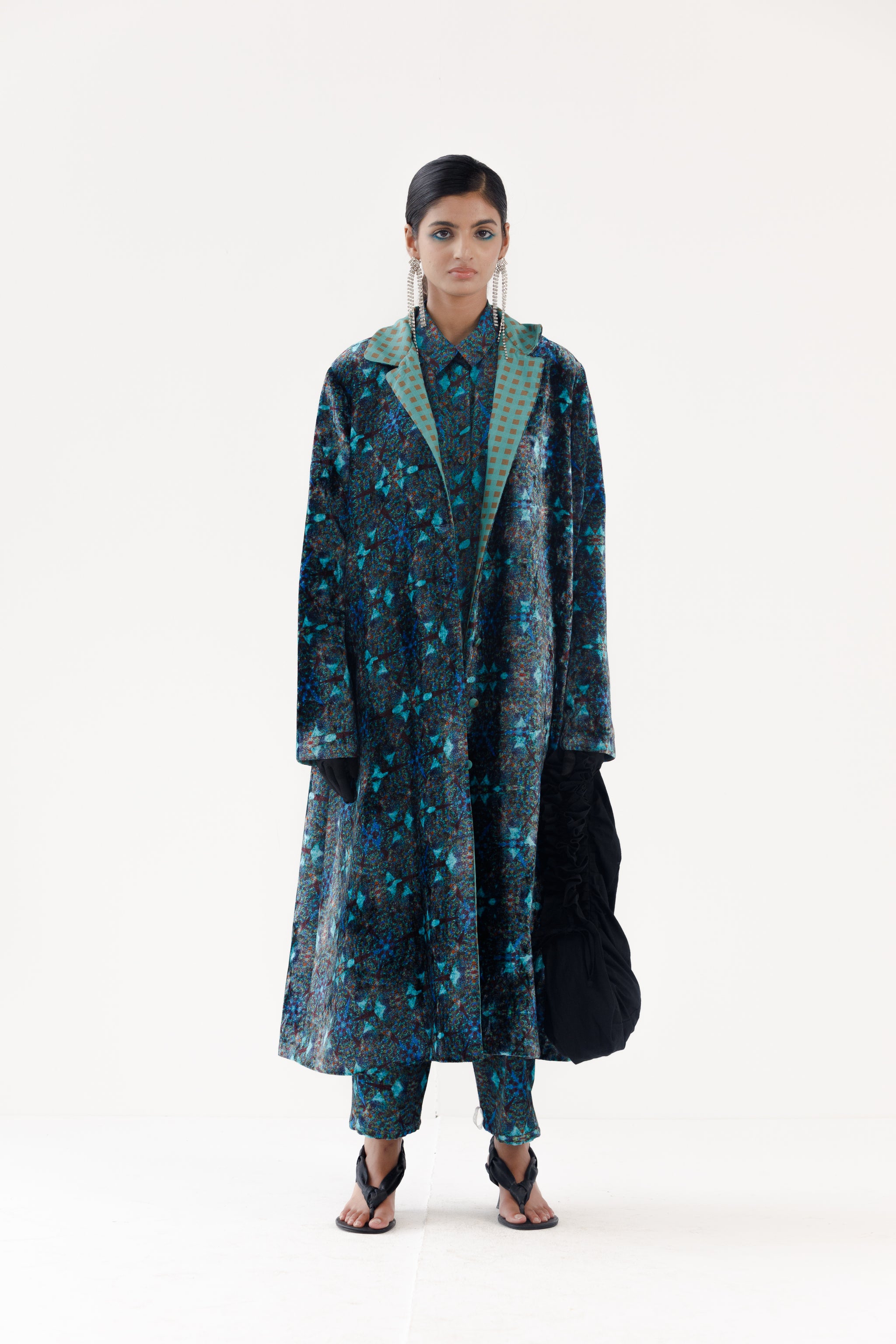 • Yavi’s signature long silk velvet jacket in a kaleidoscope of electric blues and blacks. The jacket comes with a multi checks lining and checkered collar facing and pockets.