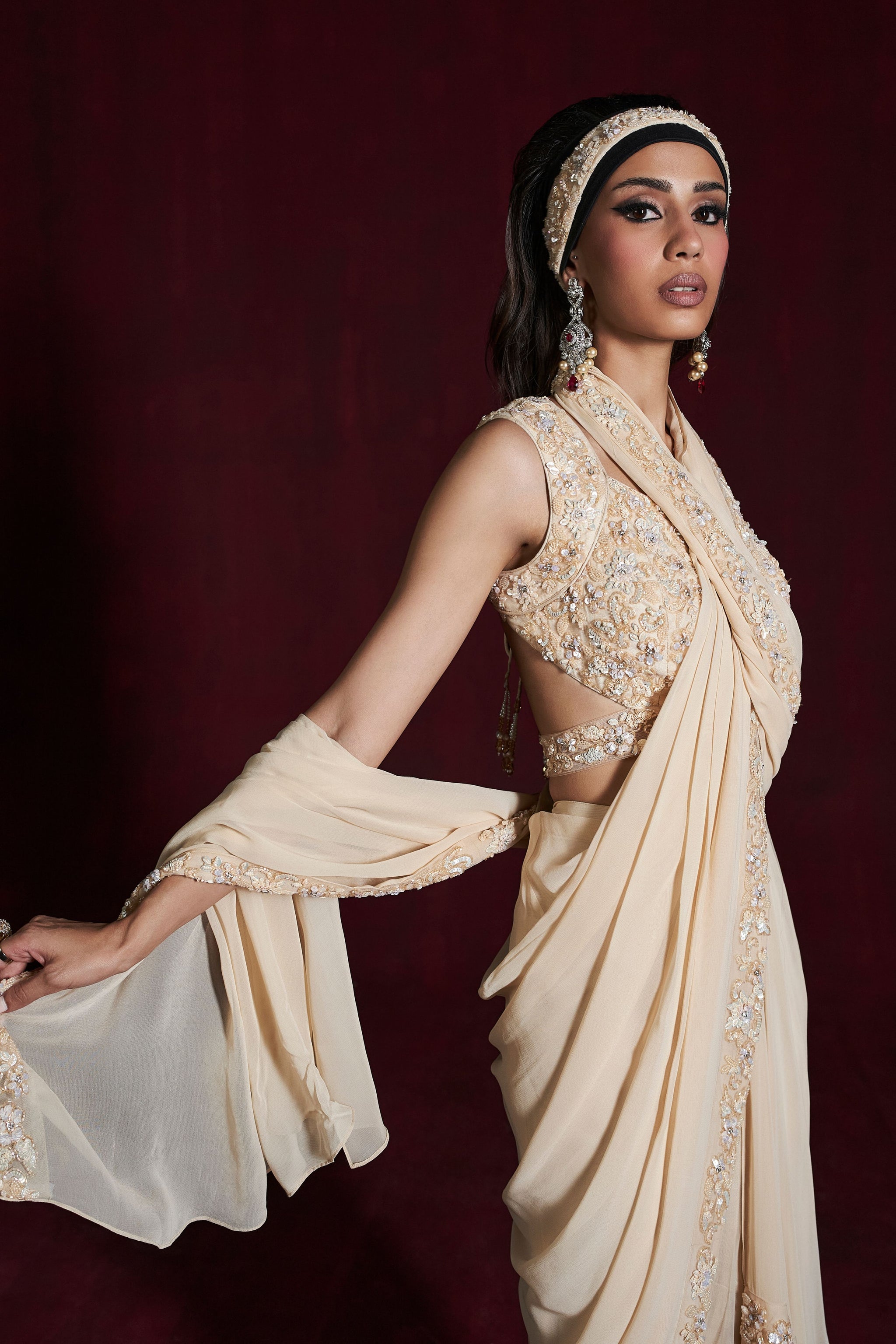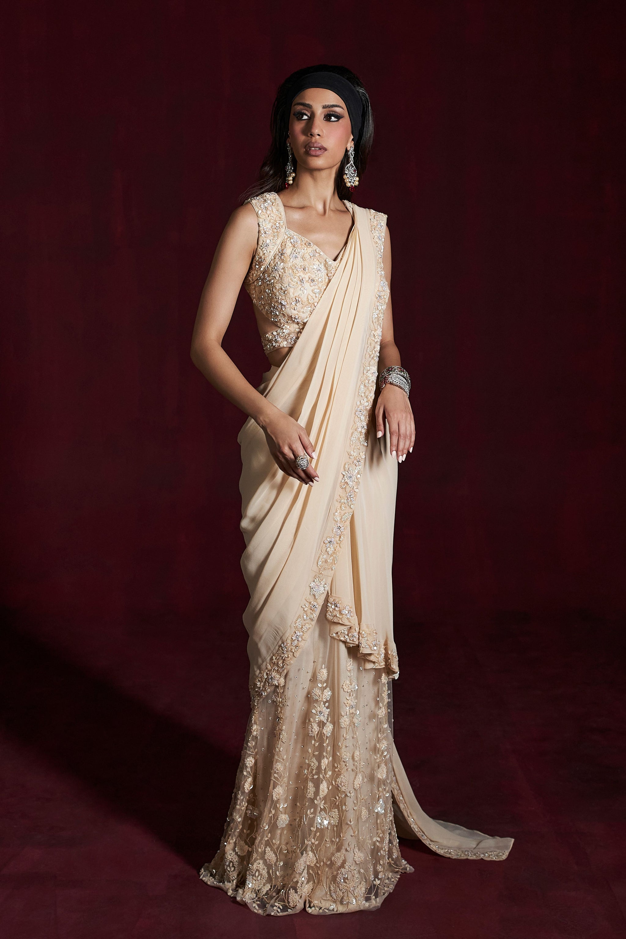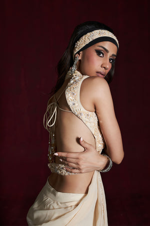 • Predraped bordered petticoat saree intricately encrusted with jarkans with sequins and cutdana paired with backless blouse and studded belt