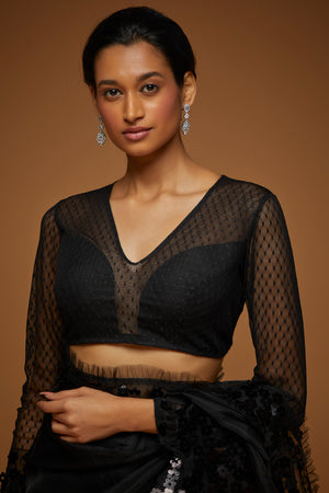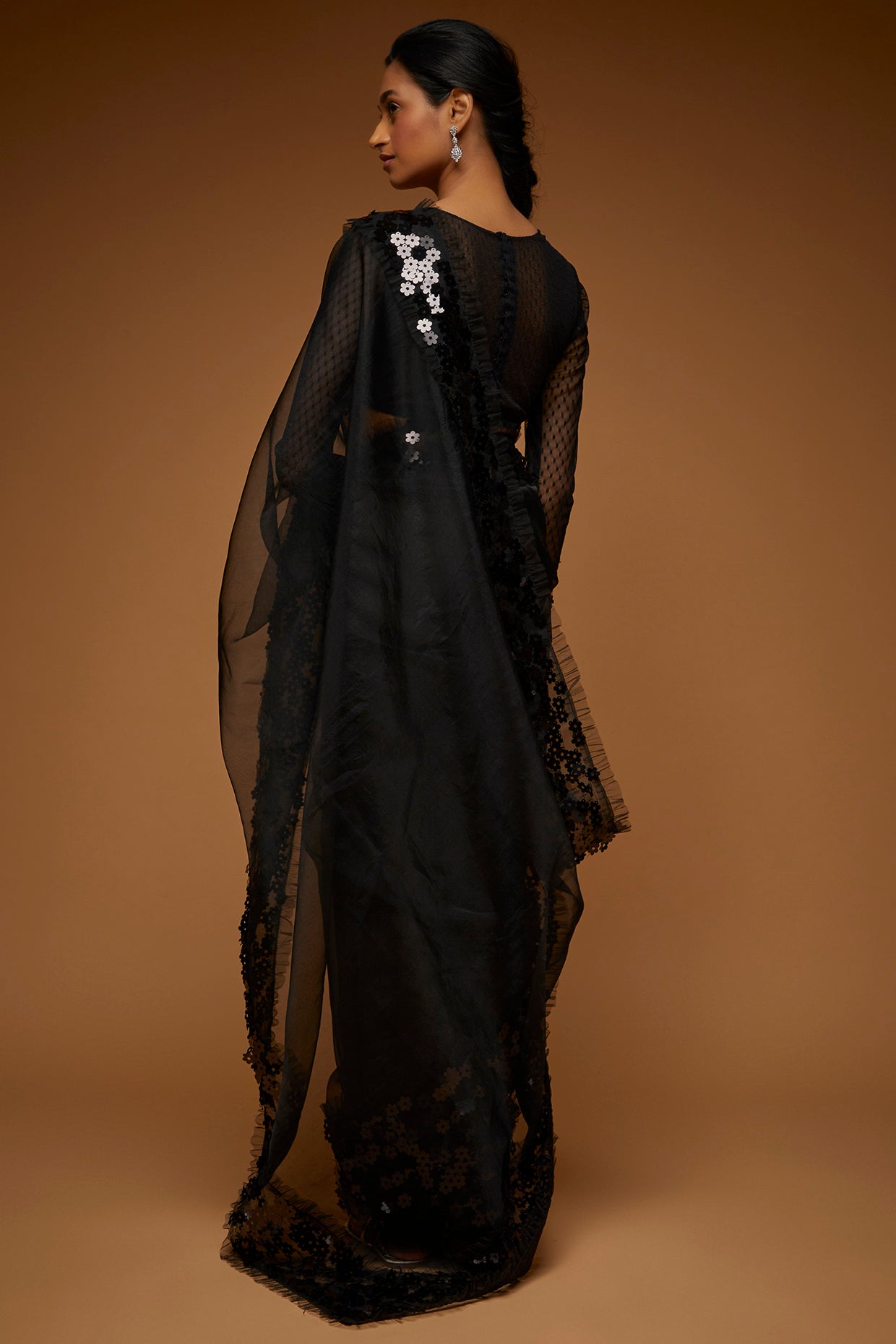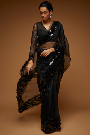 • Black NYX organza saree in floral shaped sequin work borders with sheer sleeves blouse.