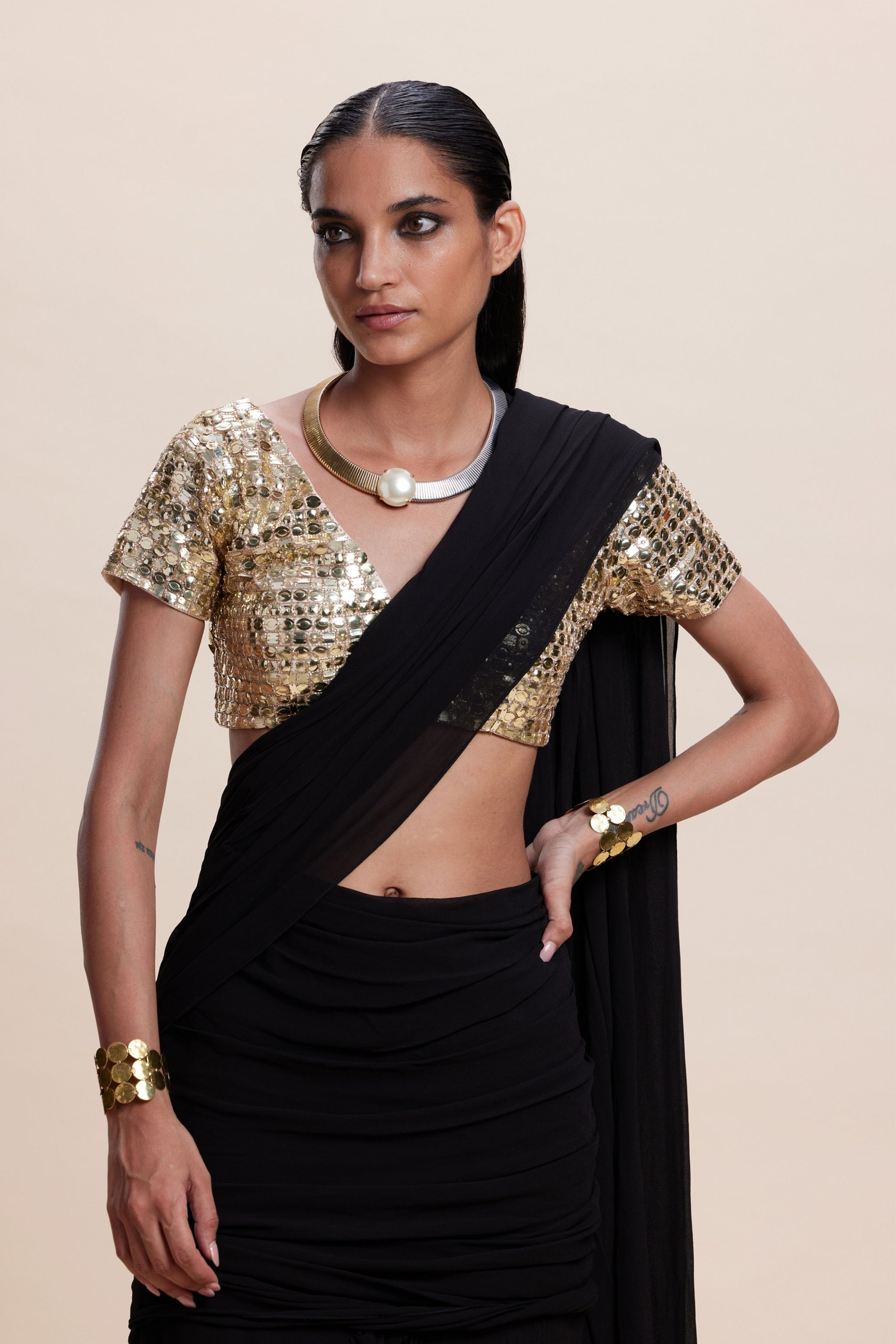 • Our black ruffle pre-draped saree set goes beyond mere fashion, it’s a bold statement. With its striking design and intricately embellished blouse