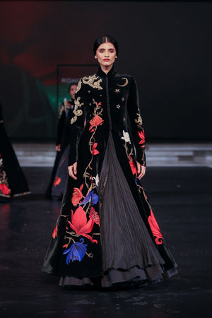 • This luxurious velvet long jacket is a statement piece, crafted with intricate handwork and resham embroidery, adding a touch of elegance and artistry to your wardrobe. The rich texture of velvet combined with the delicate embroidery elevates the design, making it perfect for festive occasions or a sophisticated evening out.