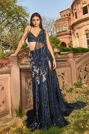 • Black sequins skirt with a tulle draped dupatta and blouse.
