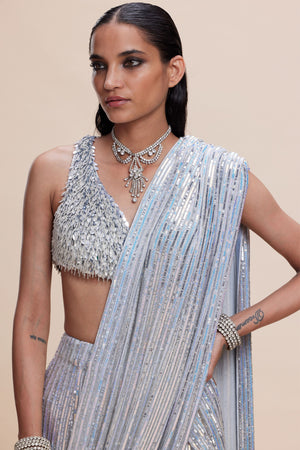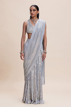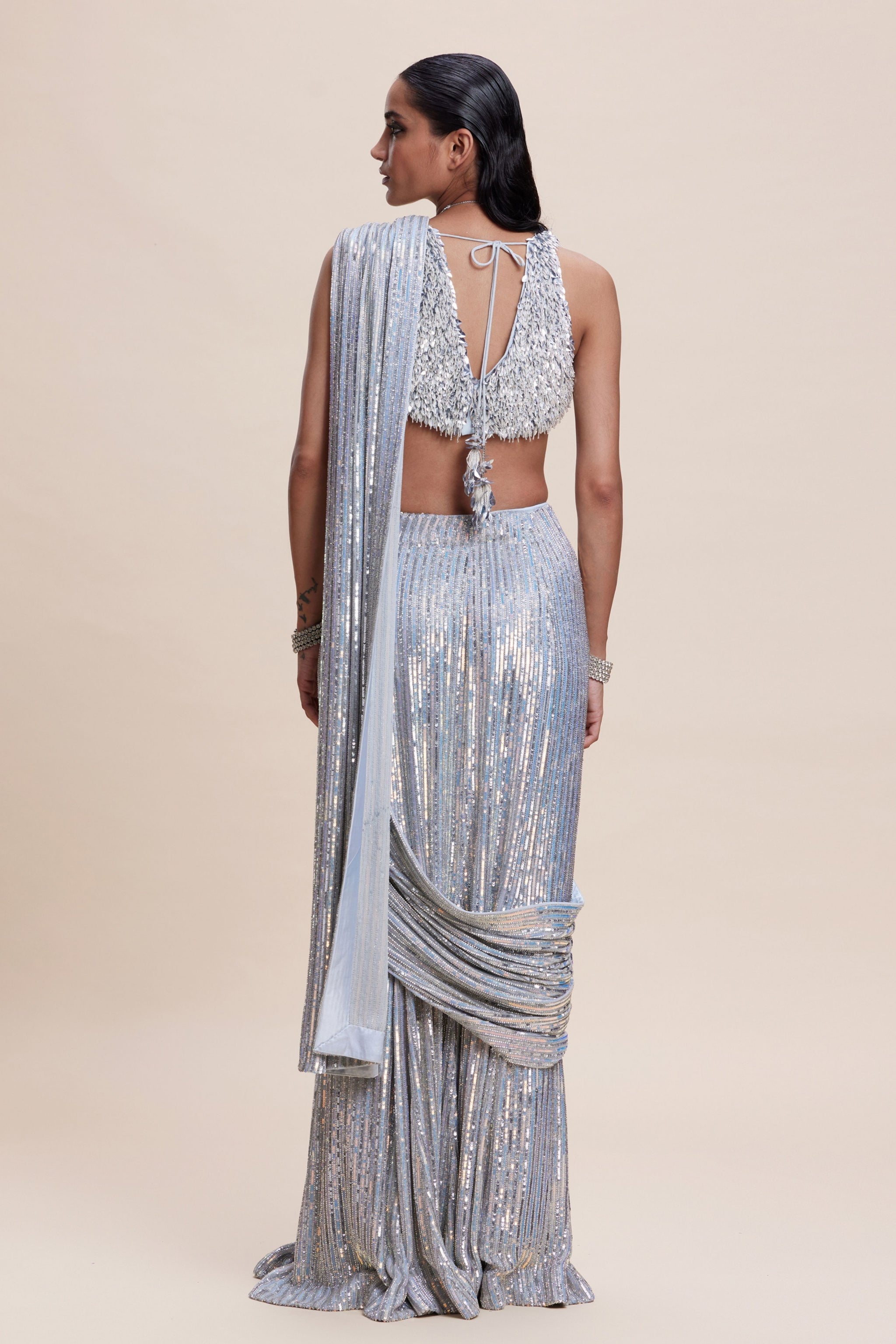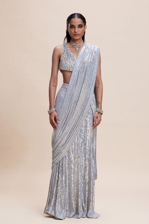 • Embrace sophistication with kangana trehan’s misty grey sequins-embellished pre-draped saree set