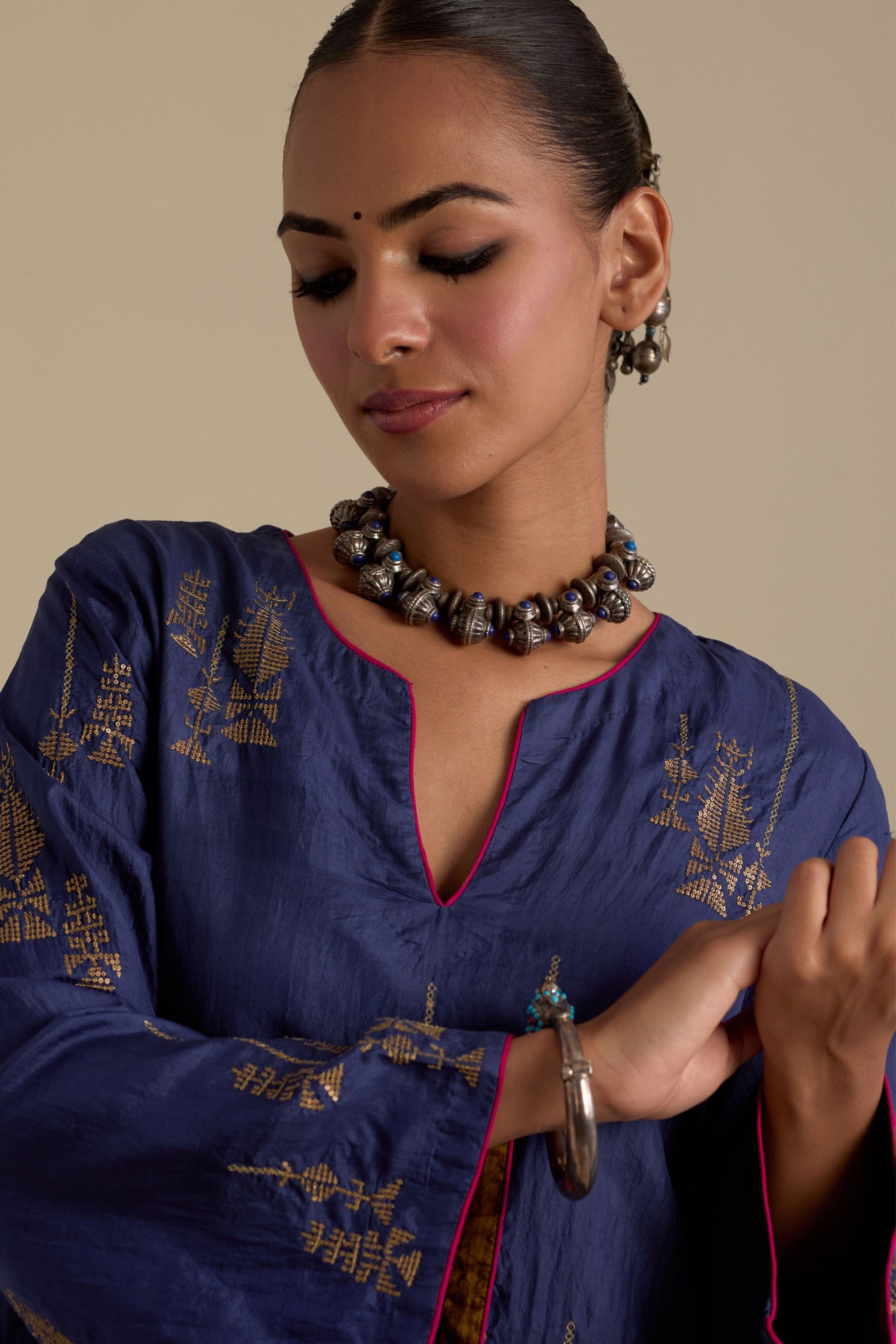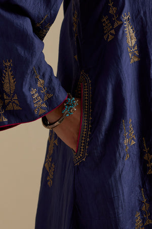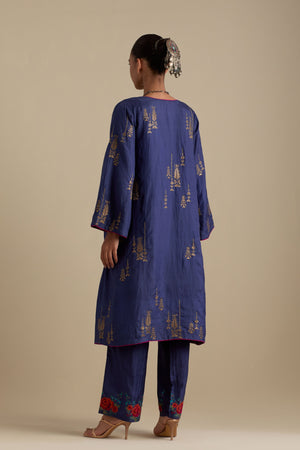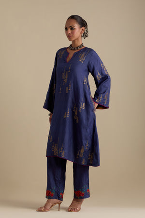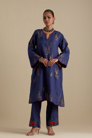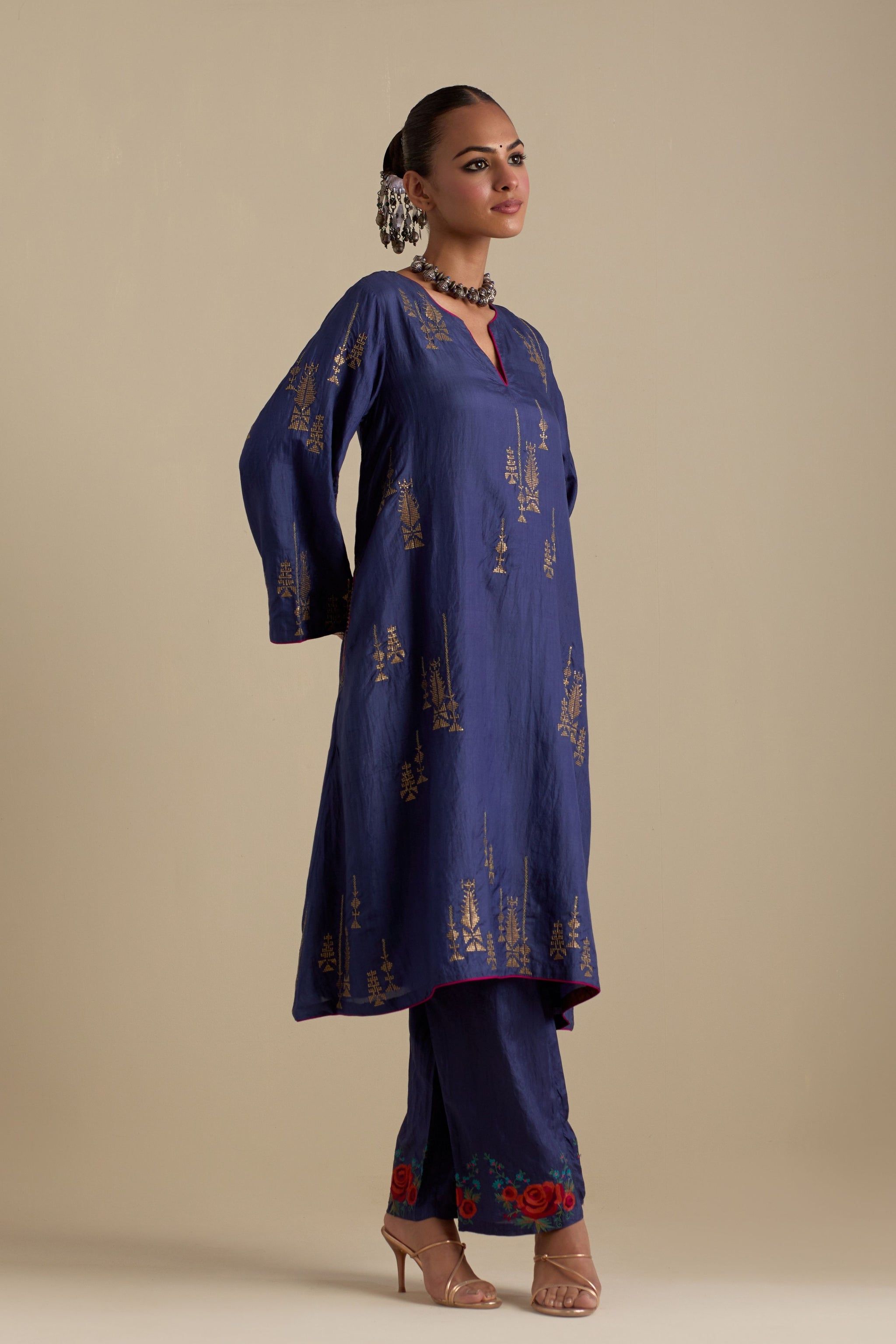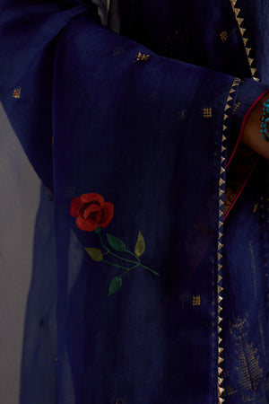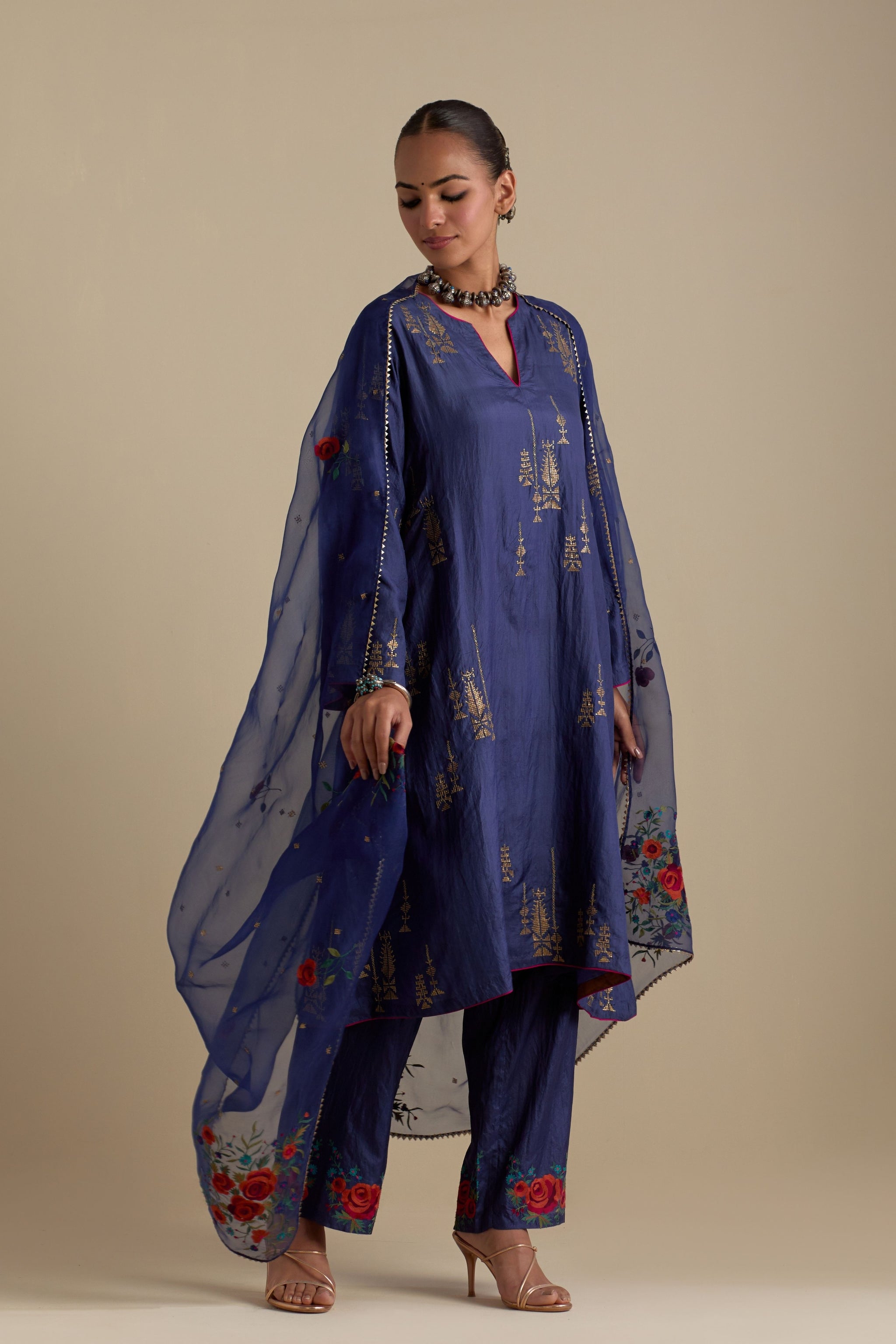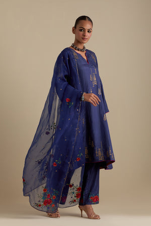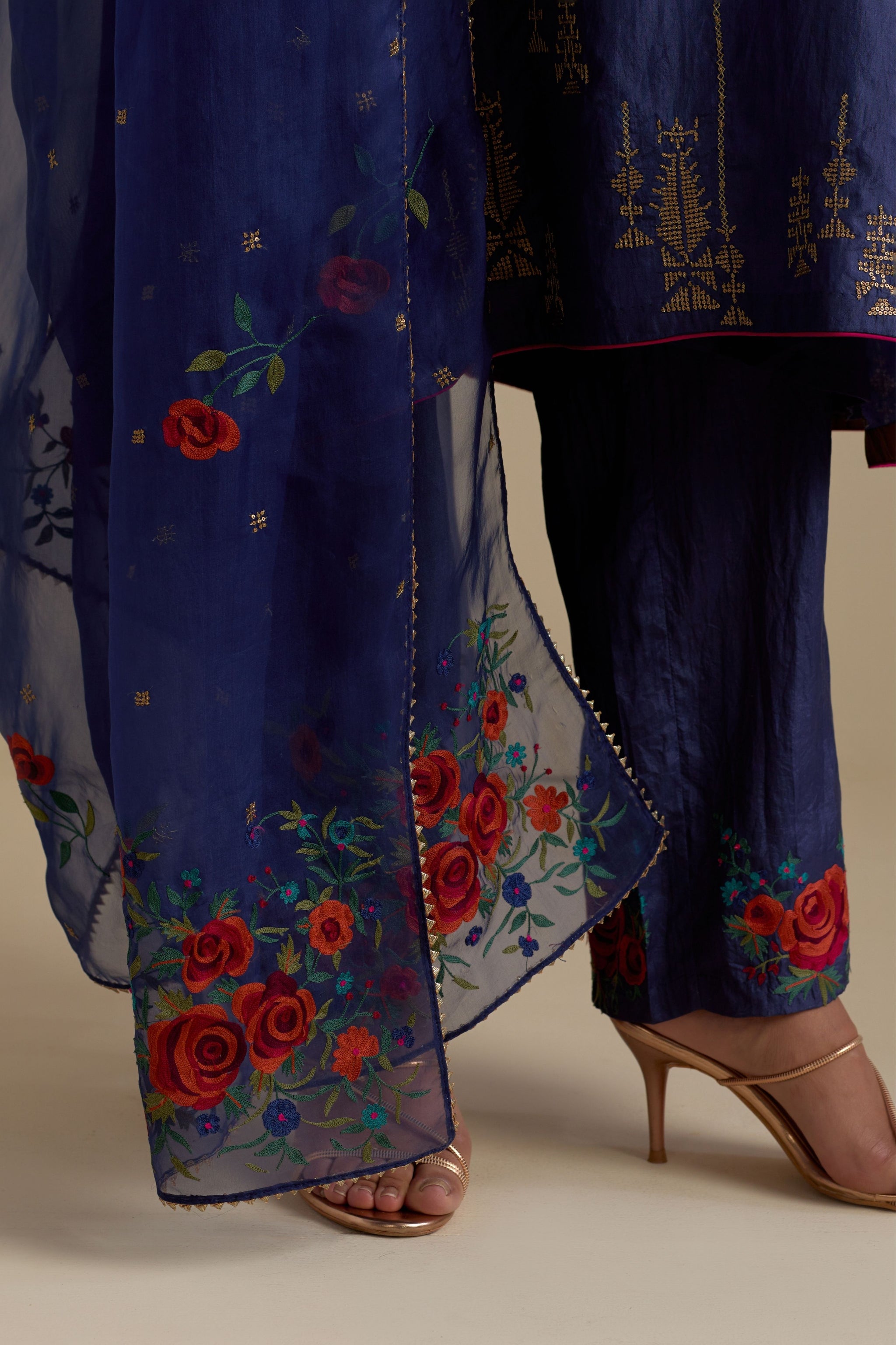 • Blue silk a-line short kurta, highlighted with all-over dull gold zari and sequins handwork butis. The garment is fully lined, paired with blue silk straight pants with roses in thread embroidery at the hem. Comes with blue silk organza dupatta, highlighted with delicate dull gold sequins and thread embroidery roses all-over; and a rose bunch at the dupatta corners.