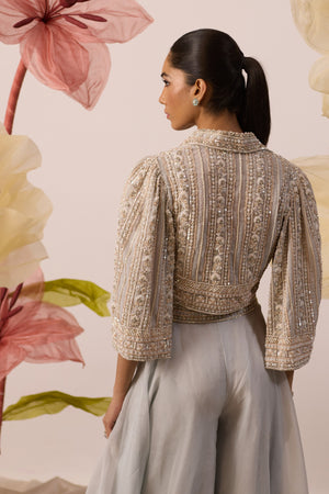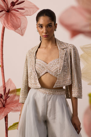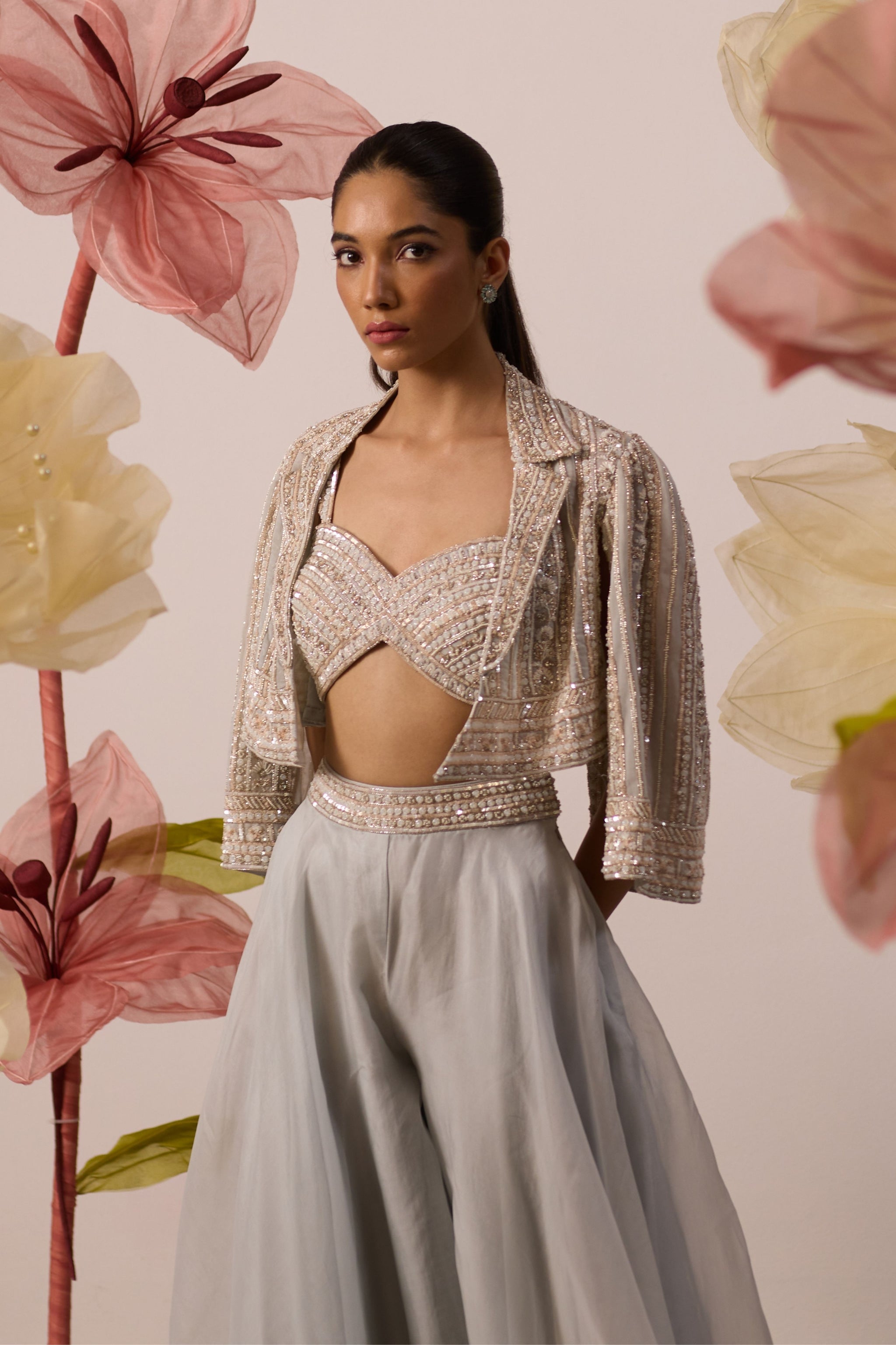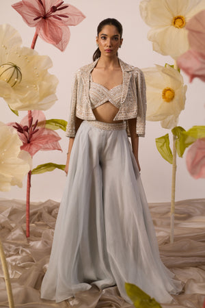 • Indulge in ethereal elegance with our enchanting ensemble. The mesmerizing flared pant set, intricate craftmanship with delicate embroidery ,gracefully over the captivating plunge balconette neckline of the blouse and heavenly heavy hand embroidered jacket .