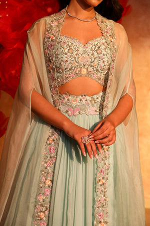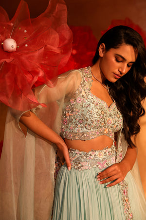 • Fabric: Lehenga :Chiffon Blouse :Raw Silk Cape :Organza