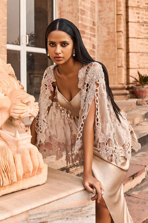 • Ivory satin draped saree and blouse with a fully embroidered tulle cape.