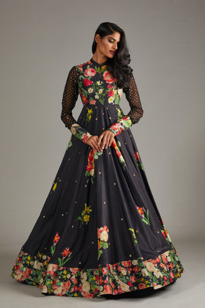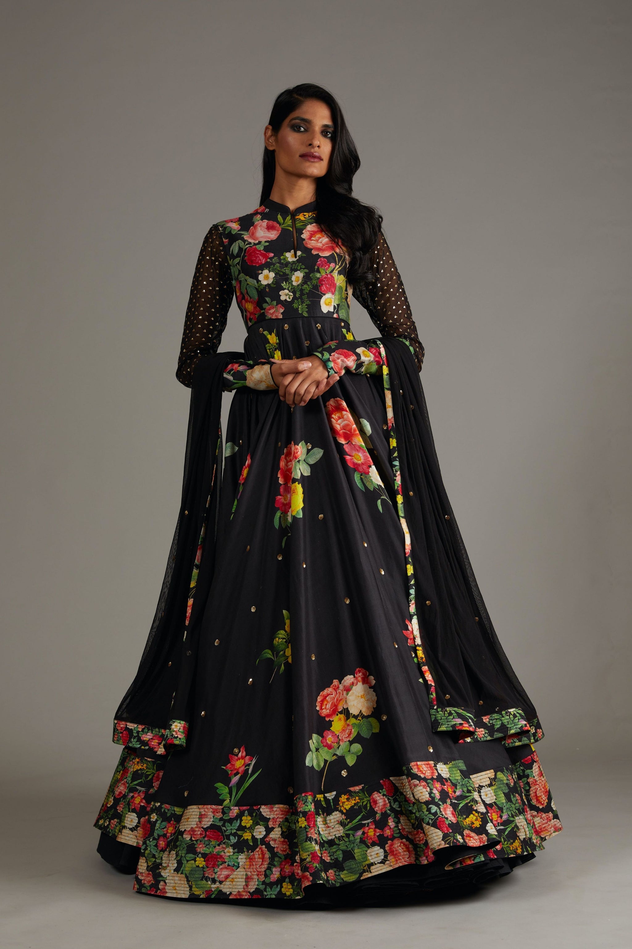 • Black chanderi Anarkali with digital print and embroidery paired with net dupatta.